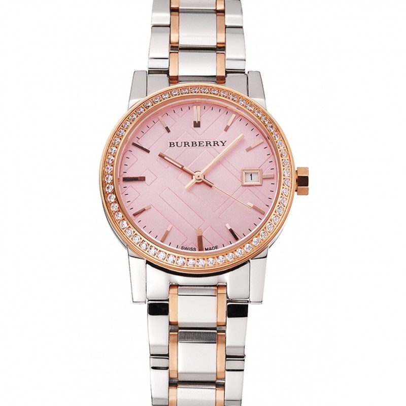 Burberry La ciudad rosa Dial caja de acero inoxidable de Rose de oro bisel de diamantes pulsera de dos tonos