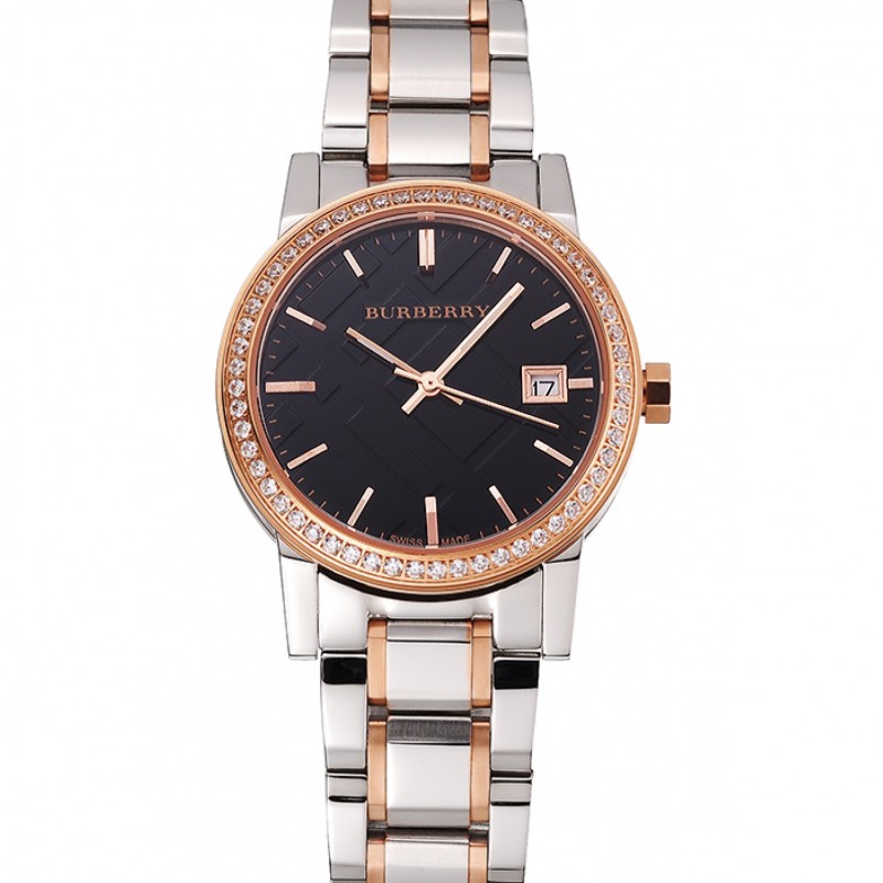 Burberry La Ciudad Dial Negro Caja de acero inoxidable de Rose de oro bisel de diamantes pulsera de dos tonos