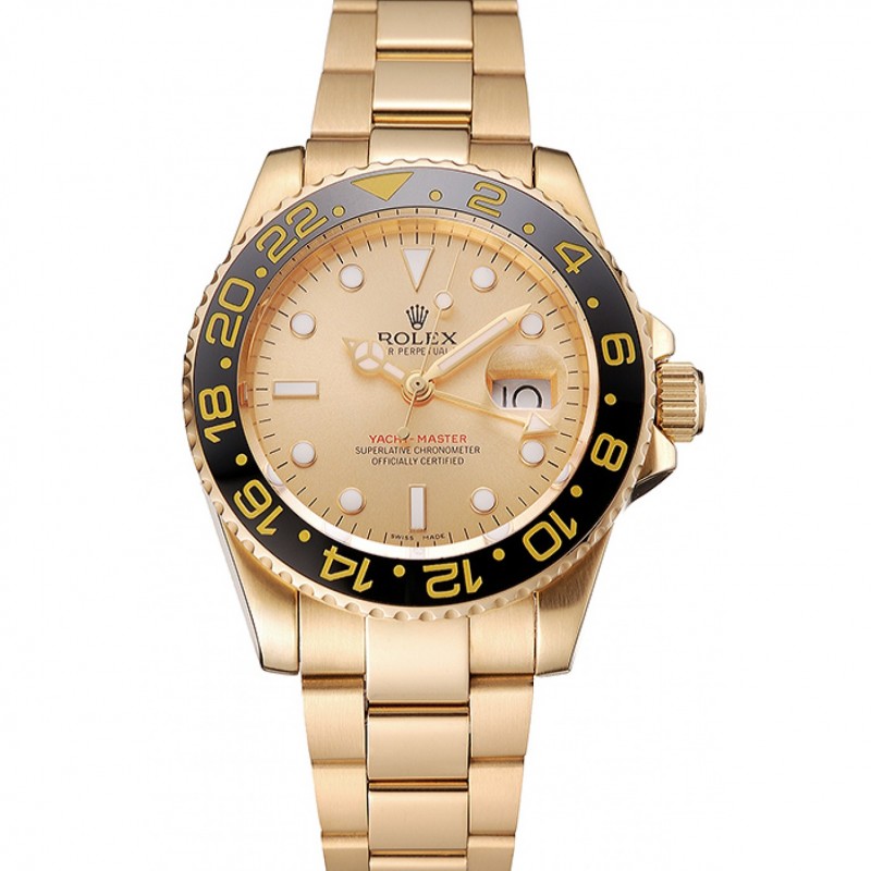 Oro Rolex GMT Master II Dial Caja Oro Bisel Negro y pulsera 1453749