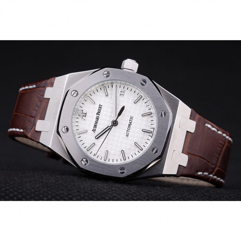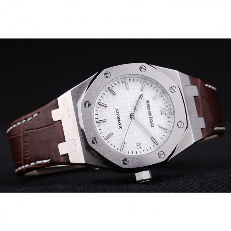 pulsera: cocodrilo Brown correa de cuero con costuras de color blanco hilo y en relieve de calor nombre de Audemars Piguet y el logotipo y un Audemars Piguet inscrito acero abatible sobre el gancho inoxidable cierre