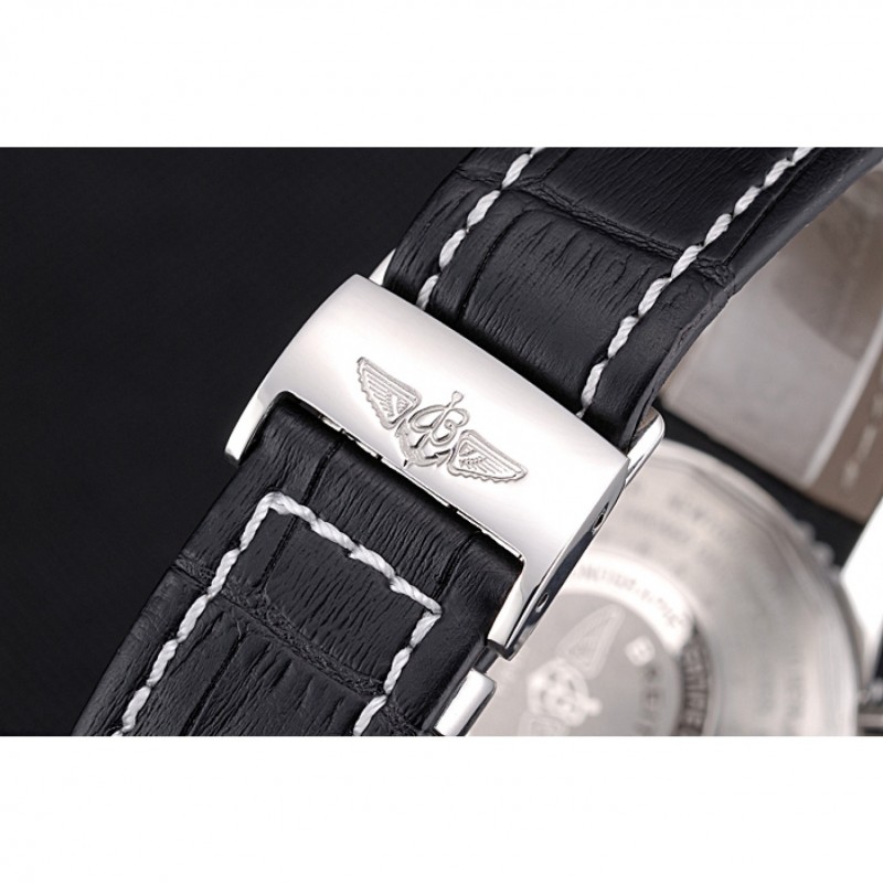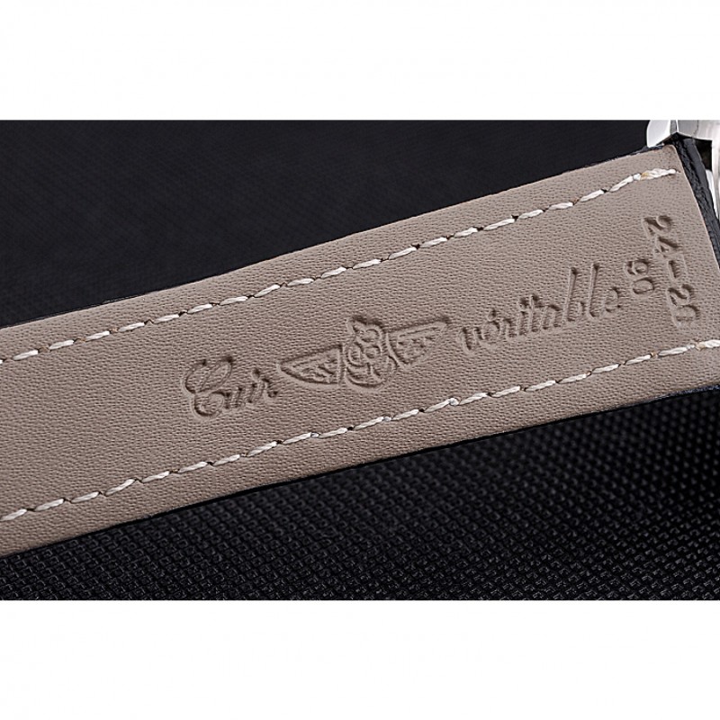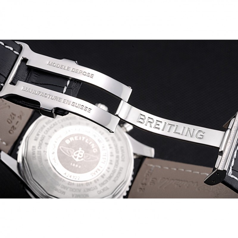 pulsera: Negro correa de piel de cocodrilo con la patente costuras de color blanco y el calor en relieve grabados Breitling y grabado pliegue de acero inoxidable en el corchete con el logotipo de Breitling en la parte superior