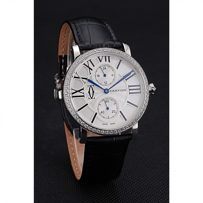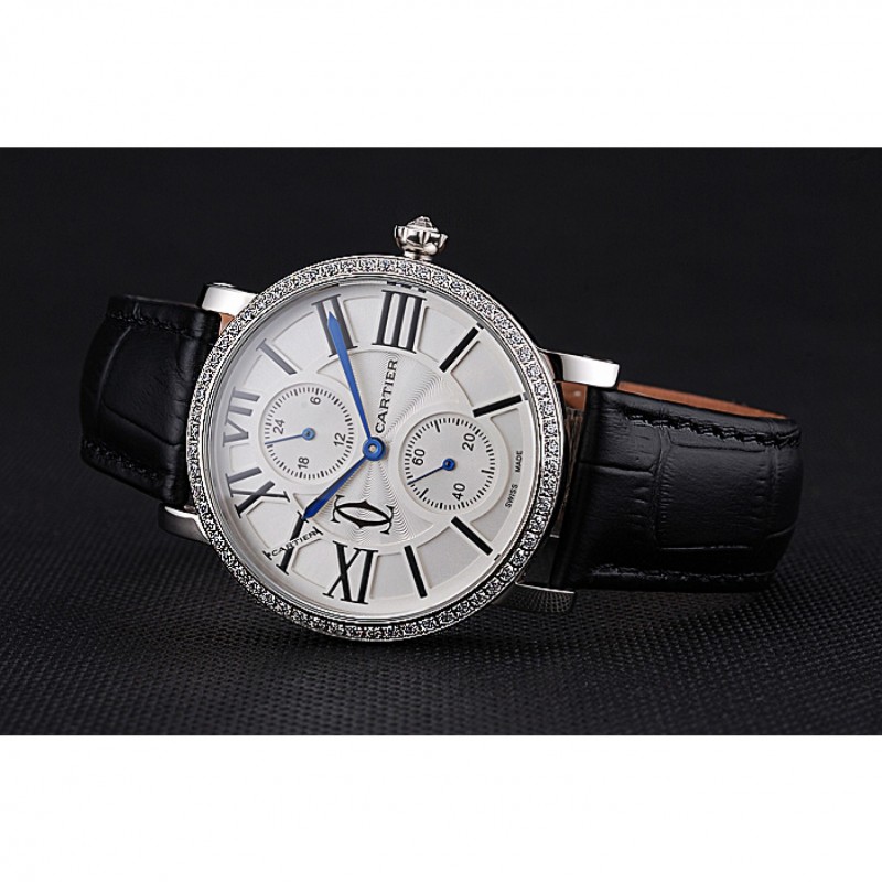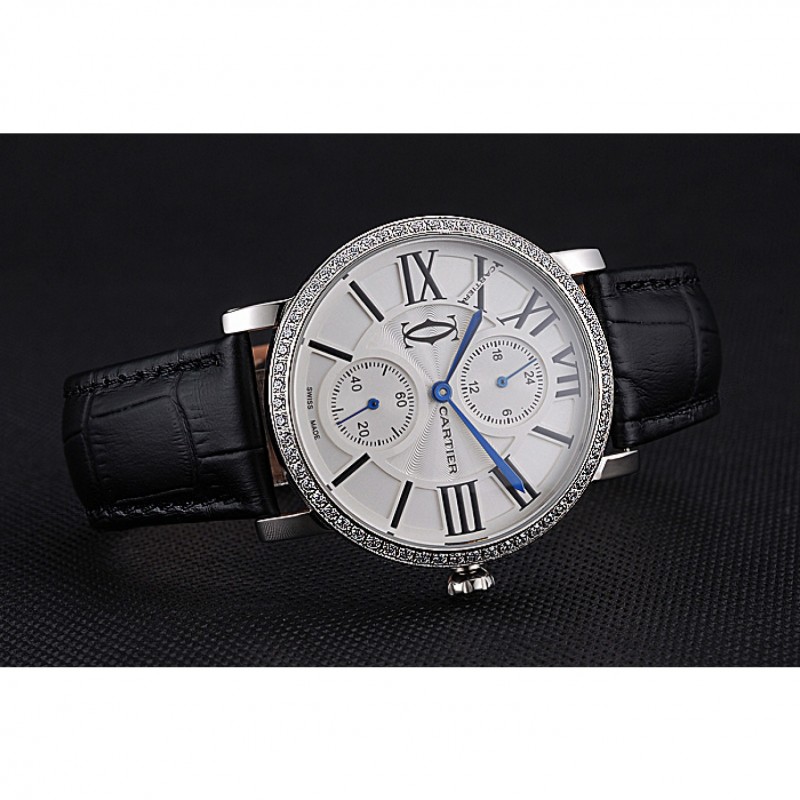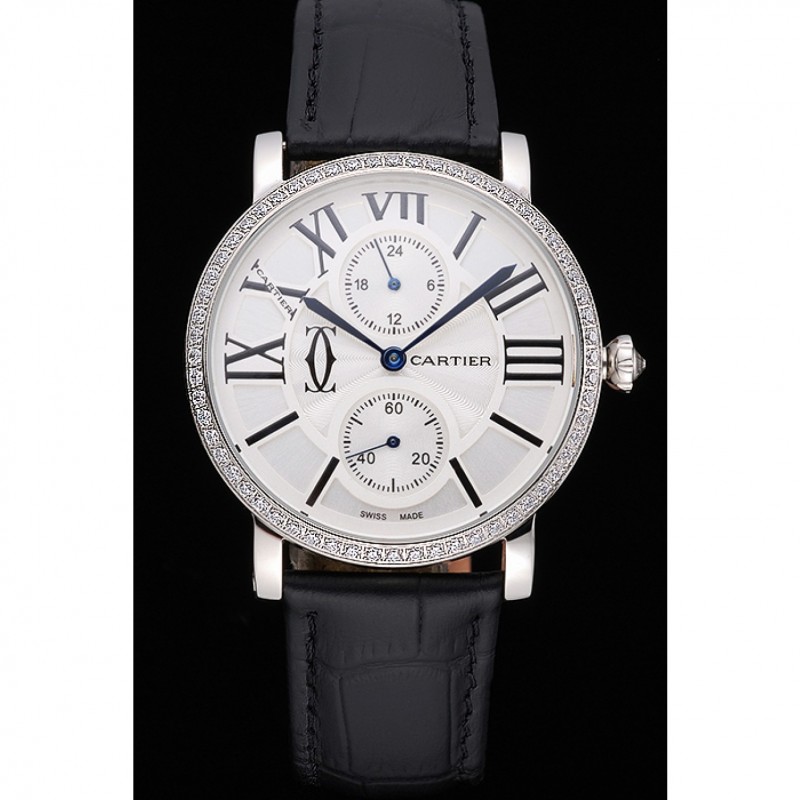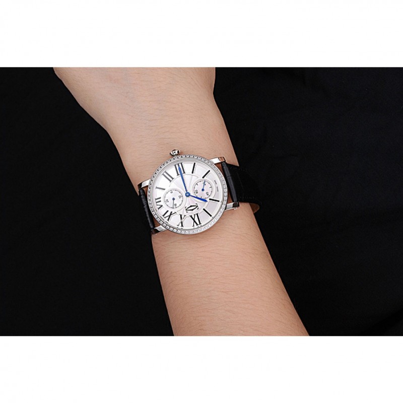 Inicio / Cartier / Cartier Ronde Segunda zona horaria Esfera Blanca, caja de acero inoxidable con correa de cuero Negro Diamantes 622804