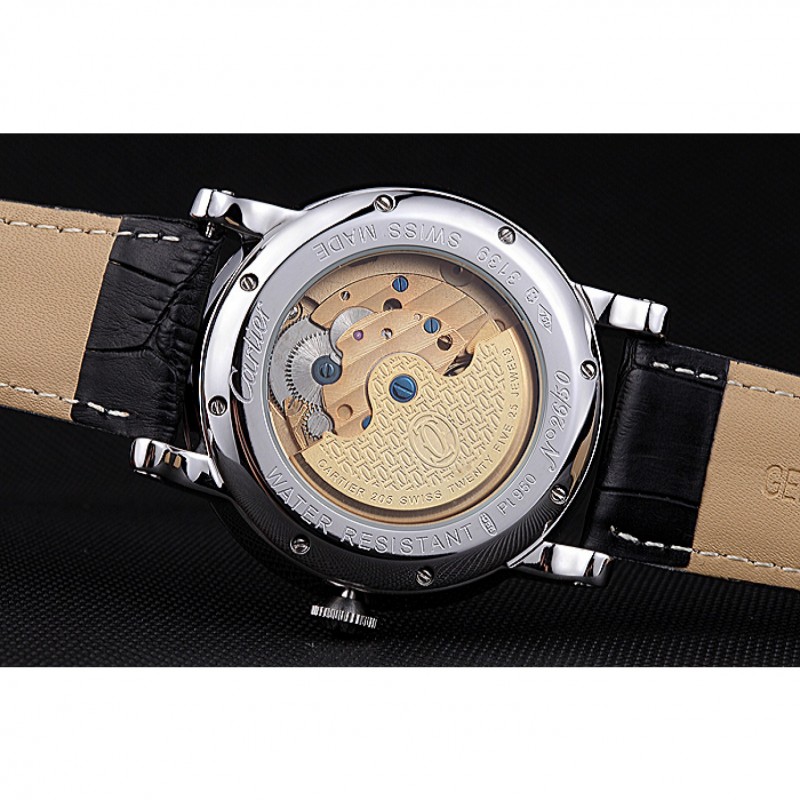 Volver: acero inoxidable pulido atornillada de nuevo con la mecánica transparentes revelando centro y la inscripción Cartier