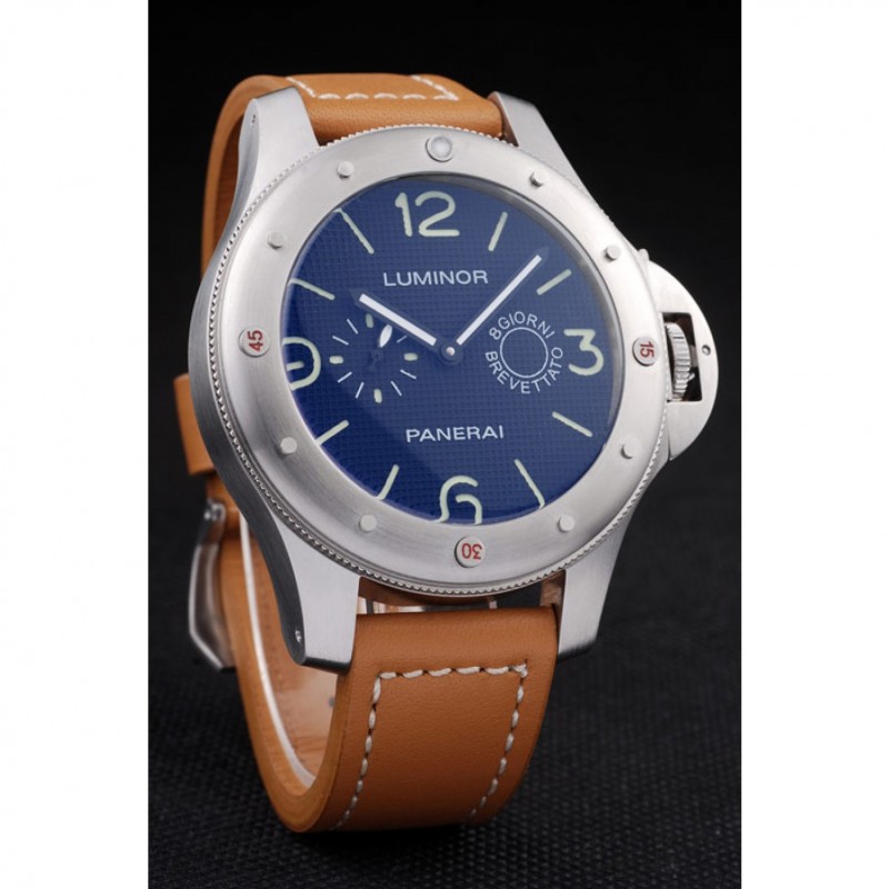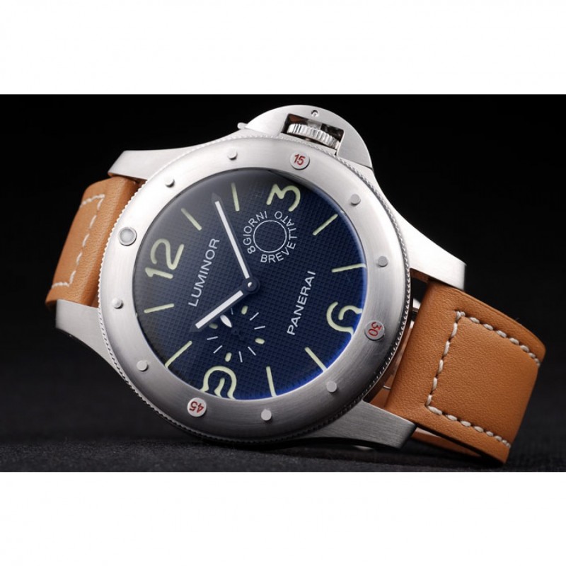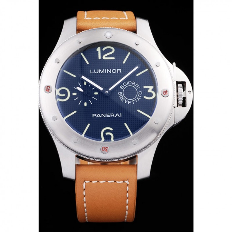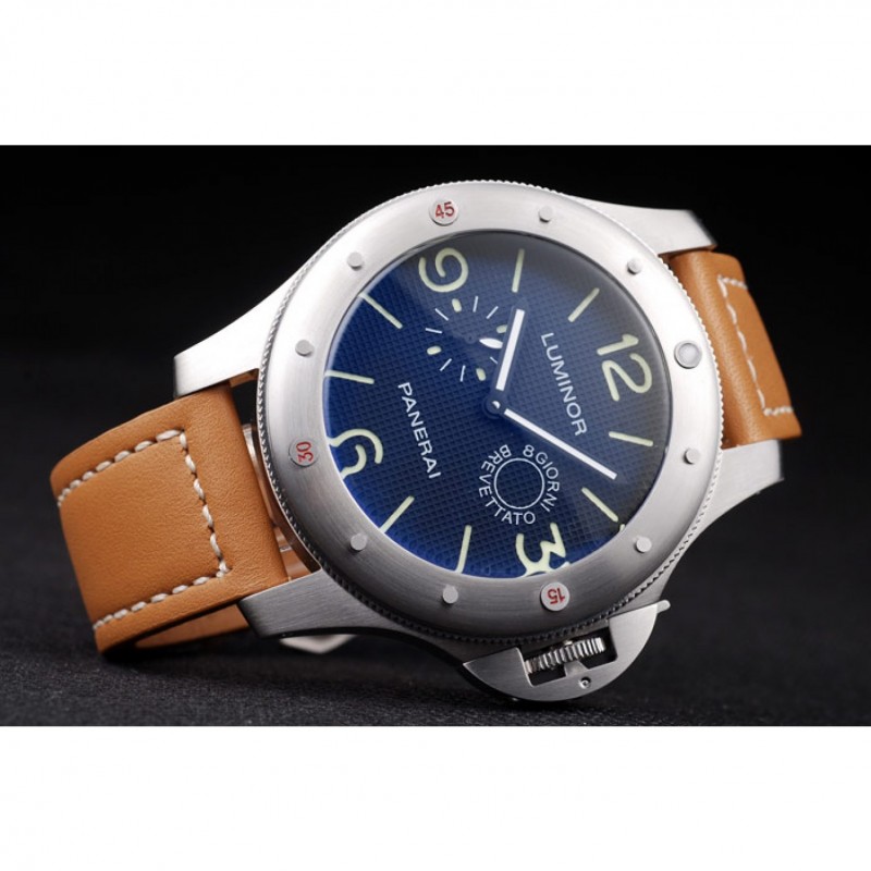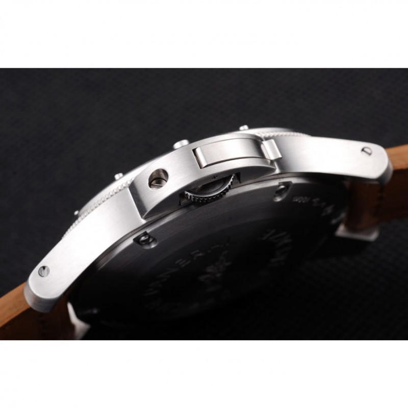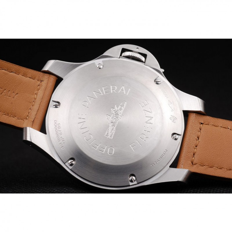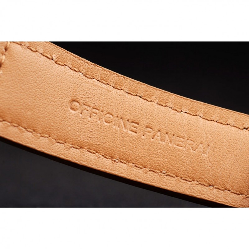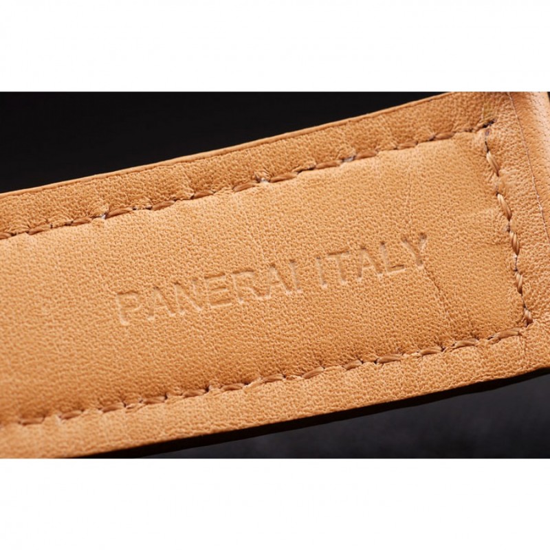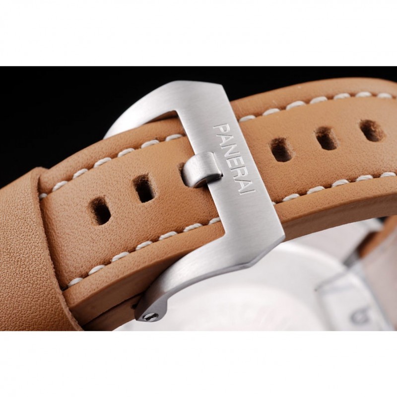 pulsera: correa de cuero marrón claro con relieve de calor sello de Officine Panerai Italia y acero inoxidable cepillado gancho hebilla de cierre con Panerai grabado