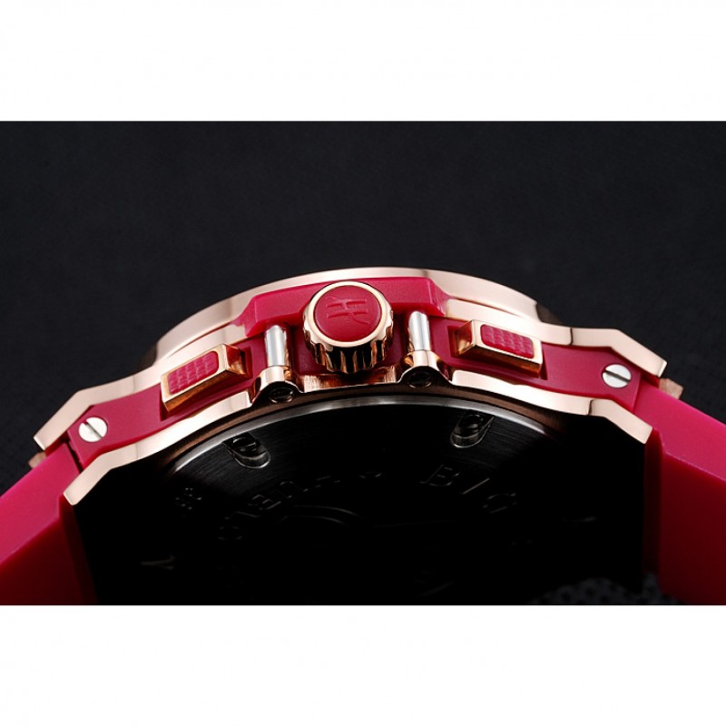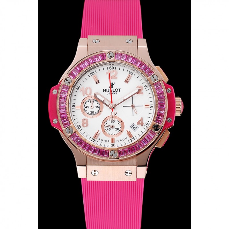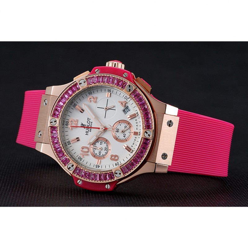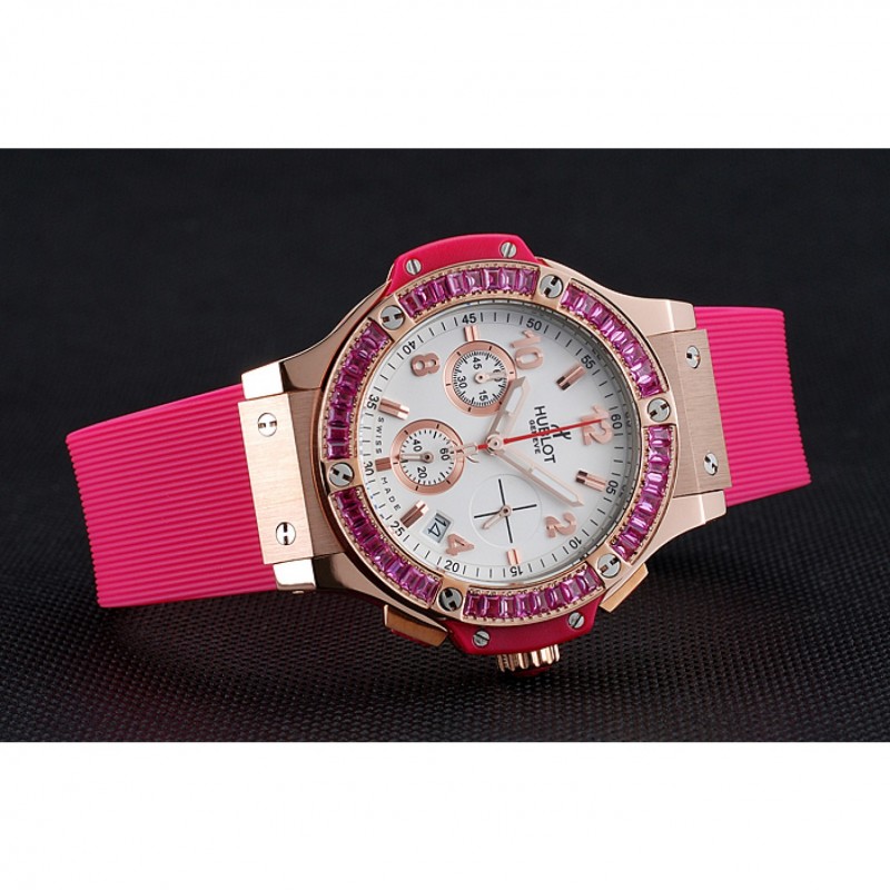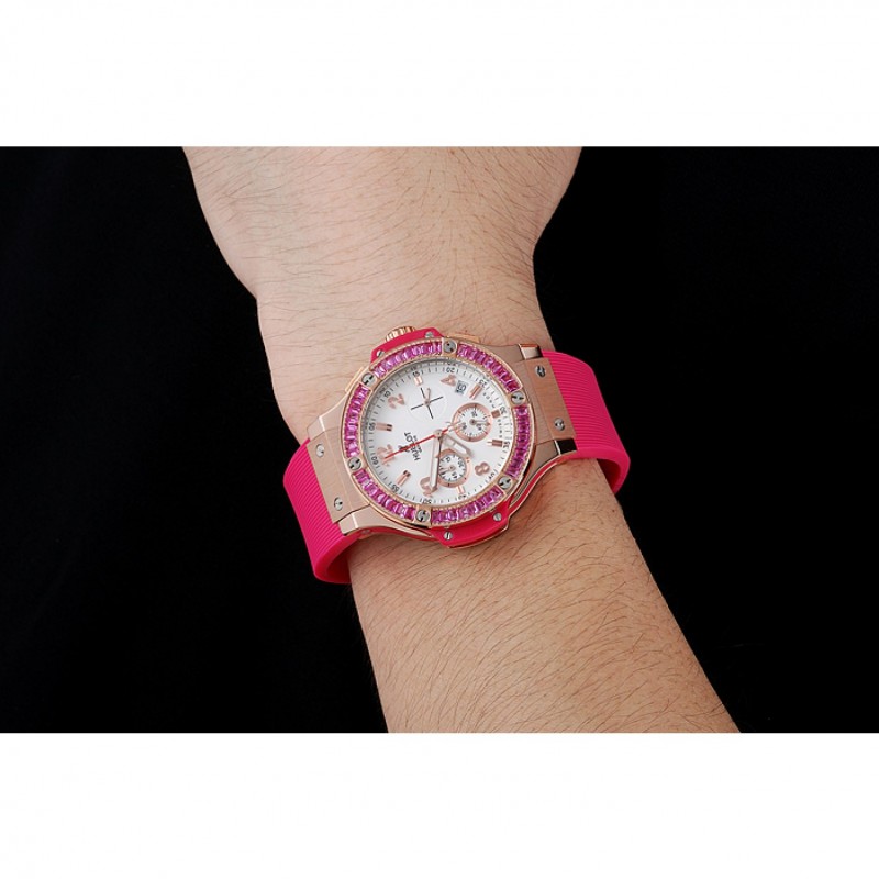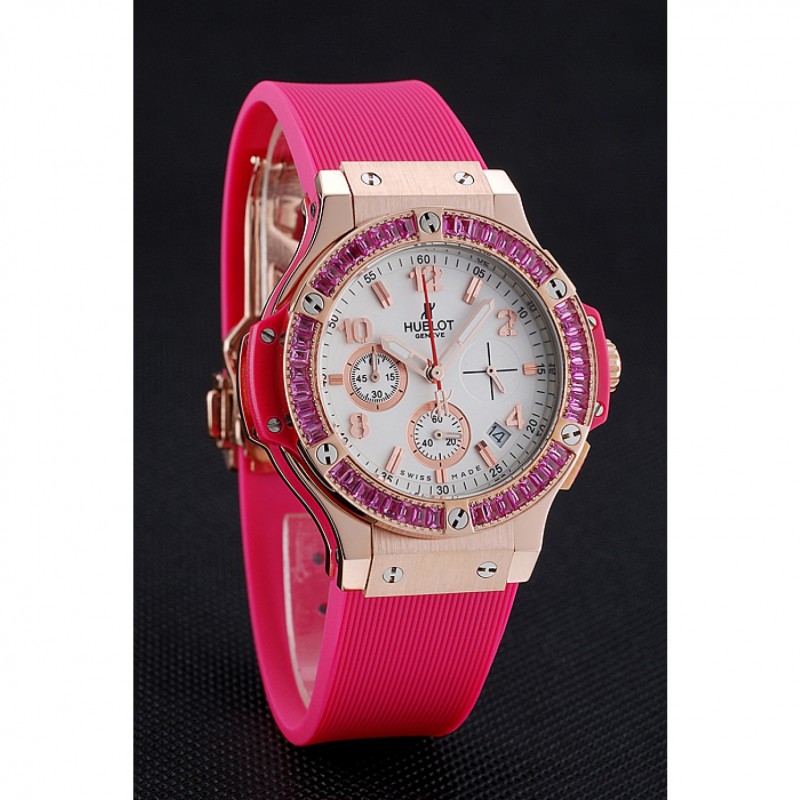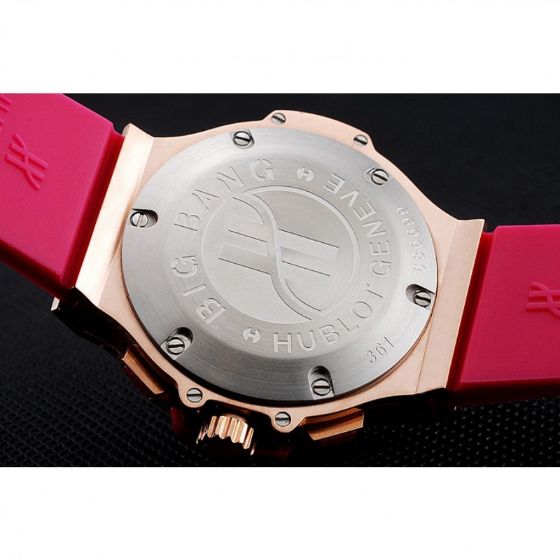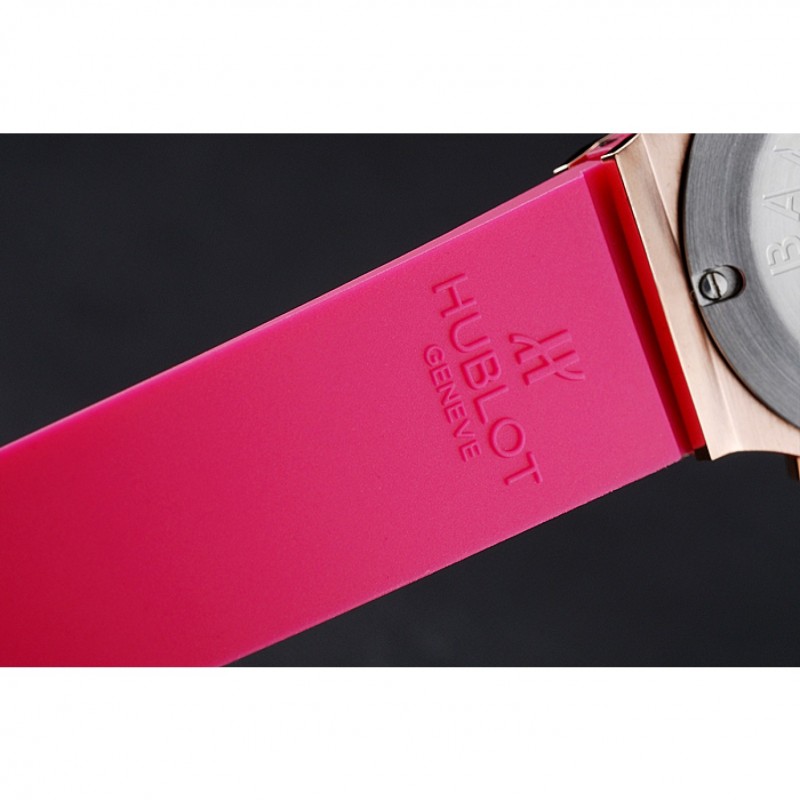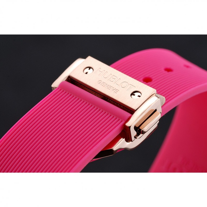 pulsera: banda de goma de color rosa con textura con cierre de botón de oro rosa gancho y grabados Hublot