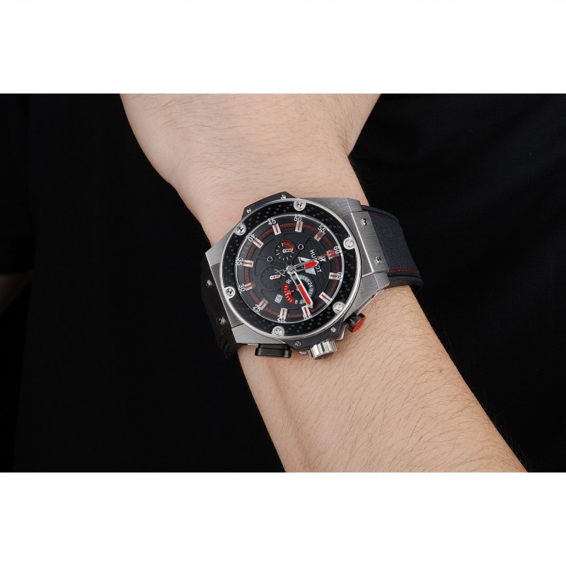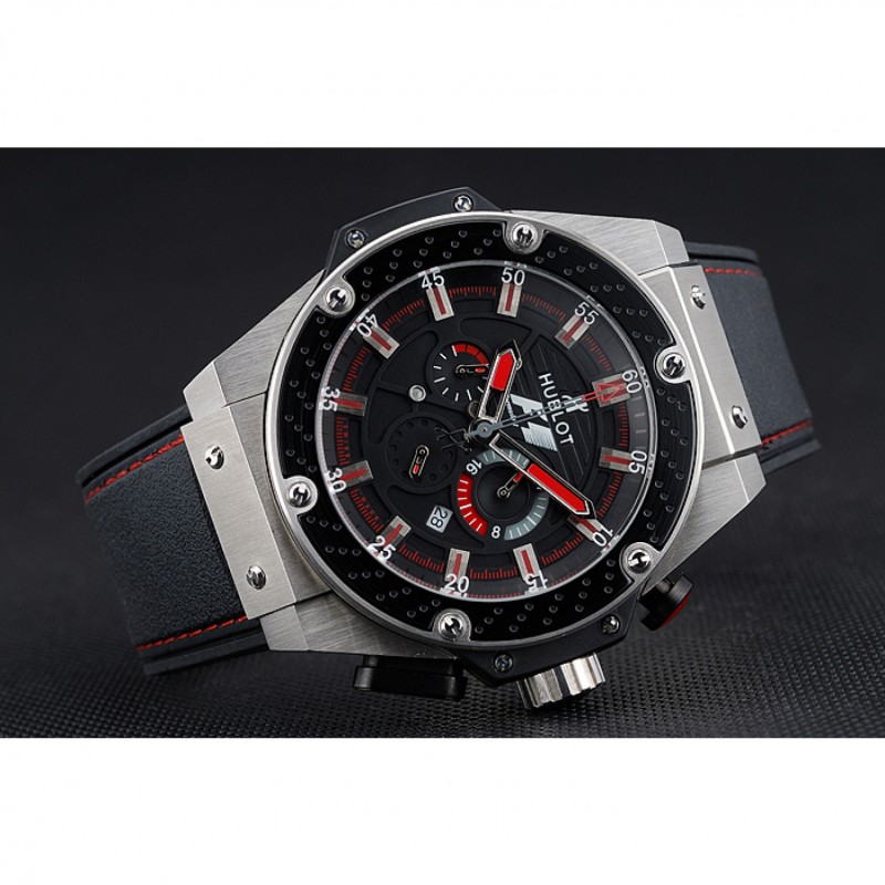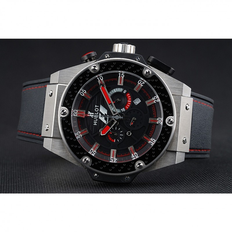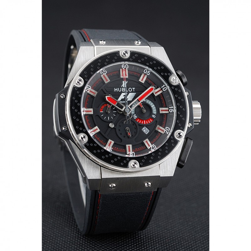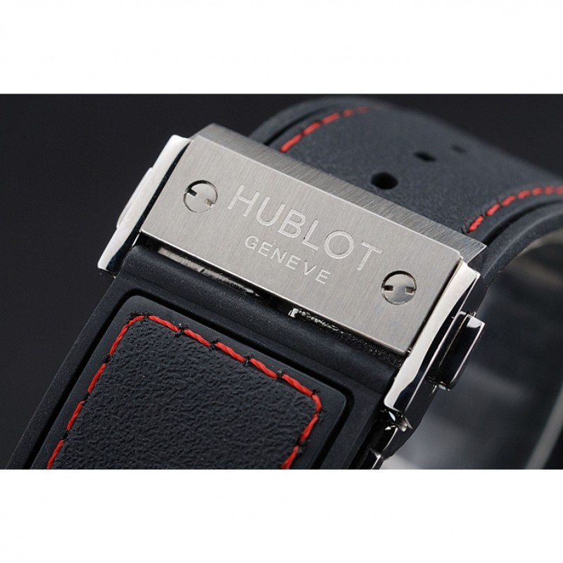 pulsera: Logo y Fórmula Hublot Geneve 1 de calor en relieve correa de caucho negro con costuras de hilo rojo y acero inoxidable cepillado Hublot Geneve gancho de liberación empuje corchete