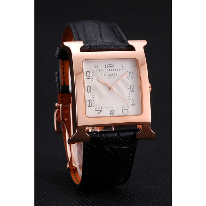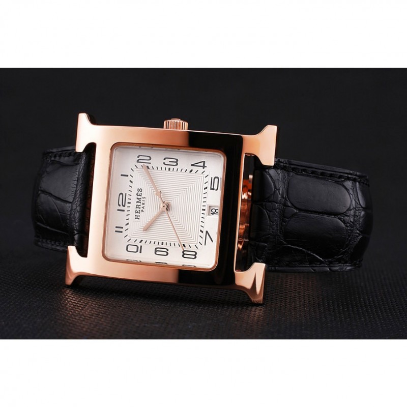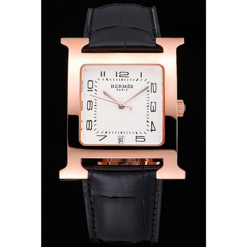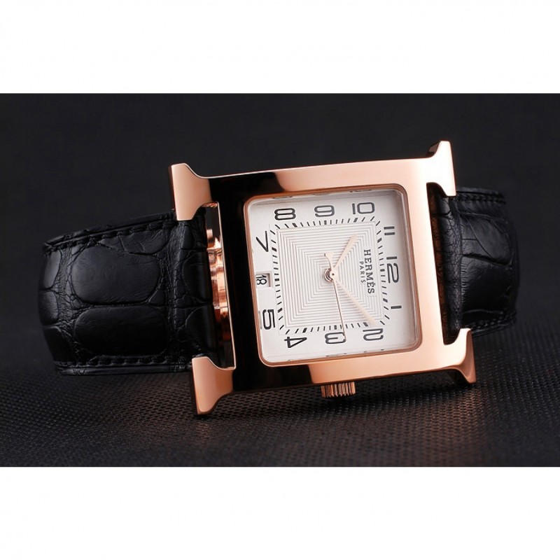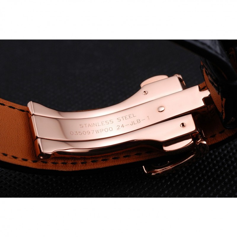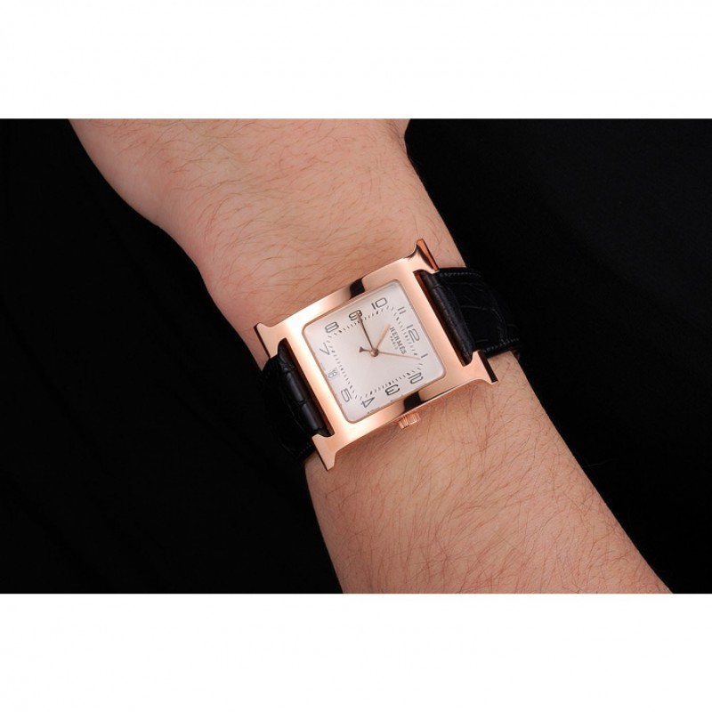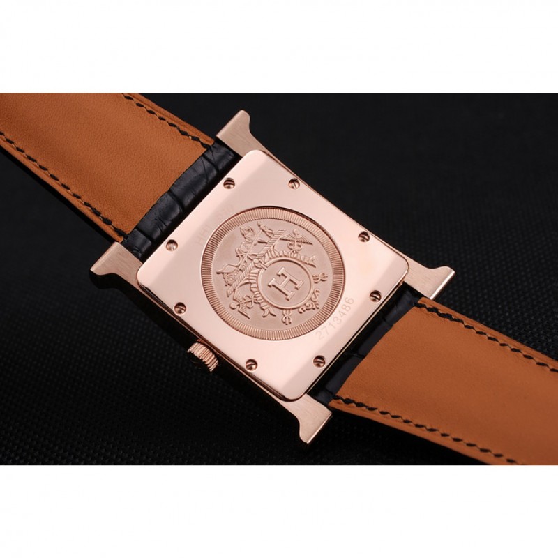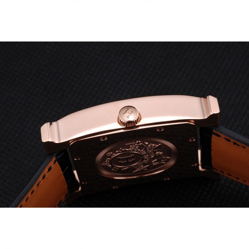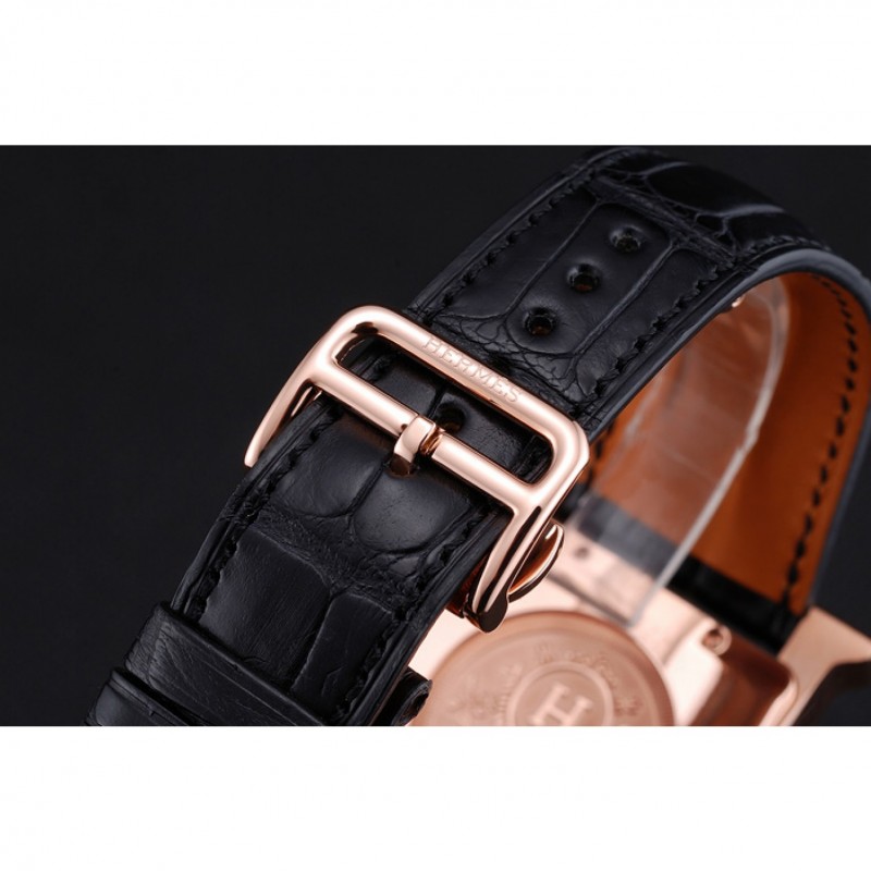pulsera: correa de piel de cocodrilo negro en relieve calor Hermes con Hermes grabado 18K rose-chapado en oro empujar de liberación gancho-broche