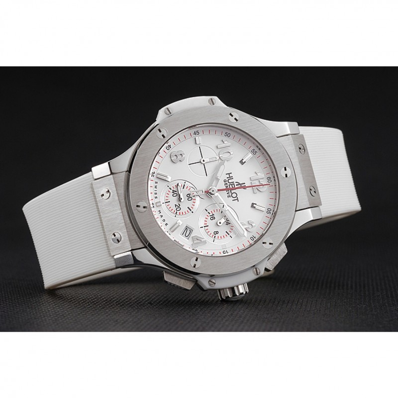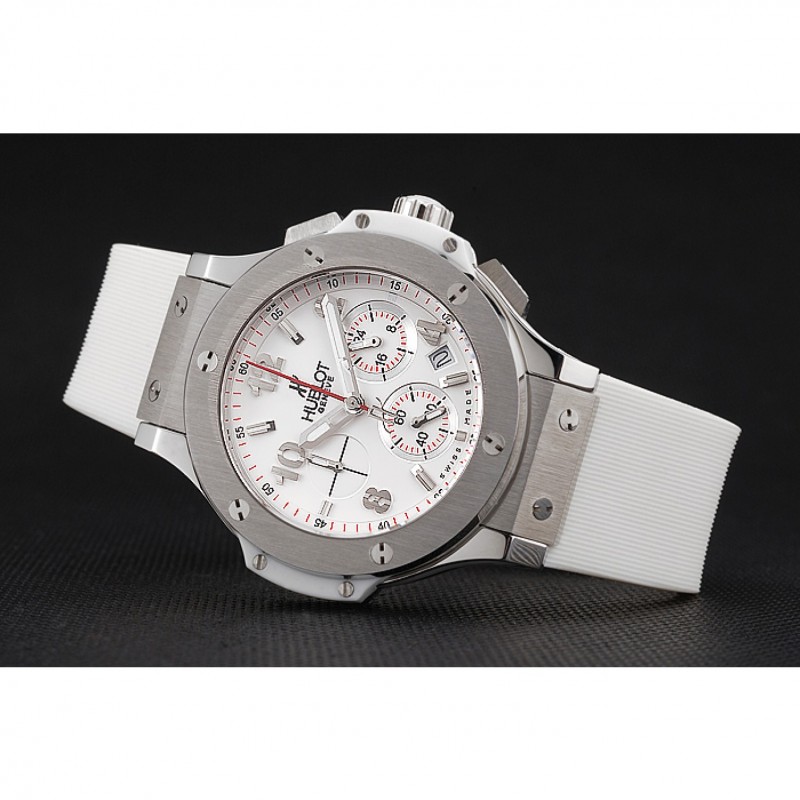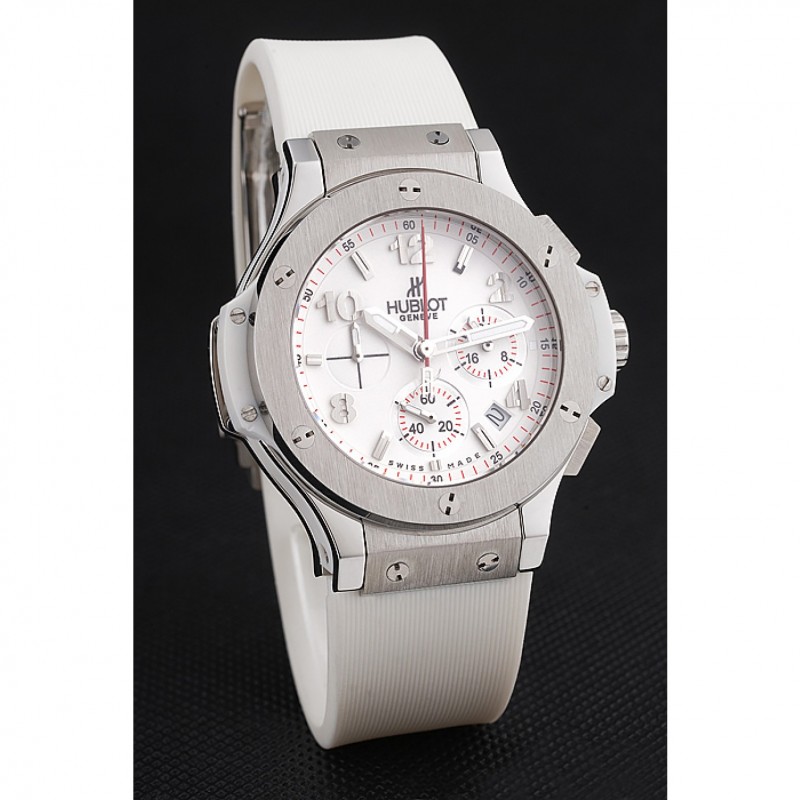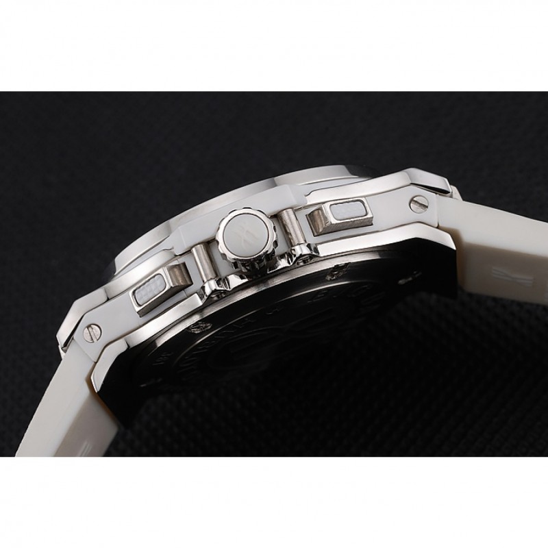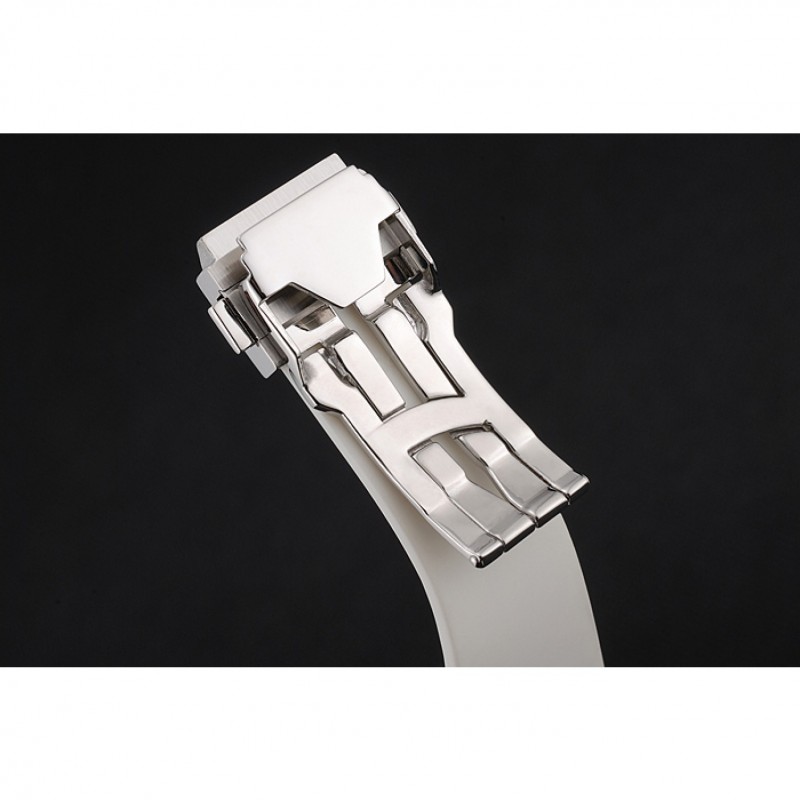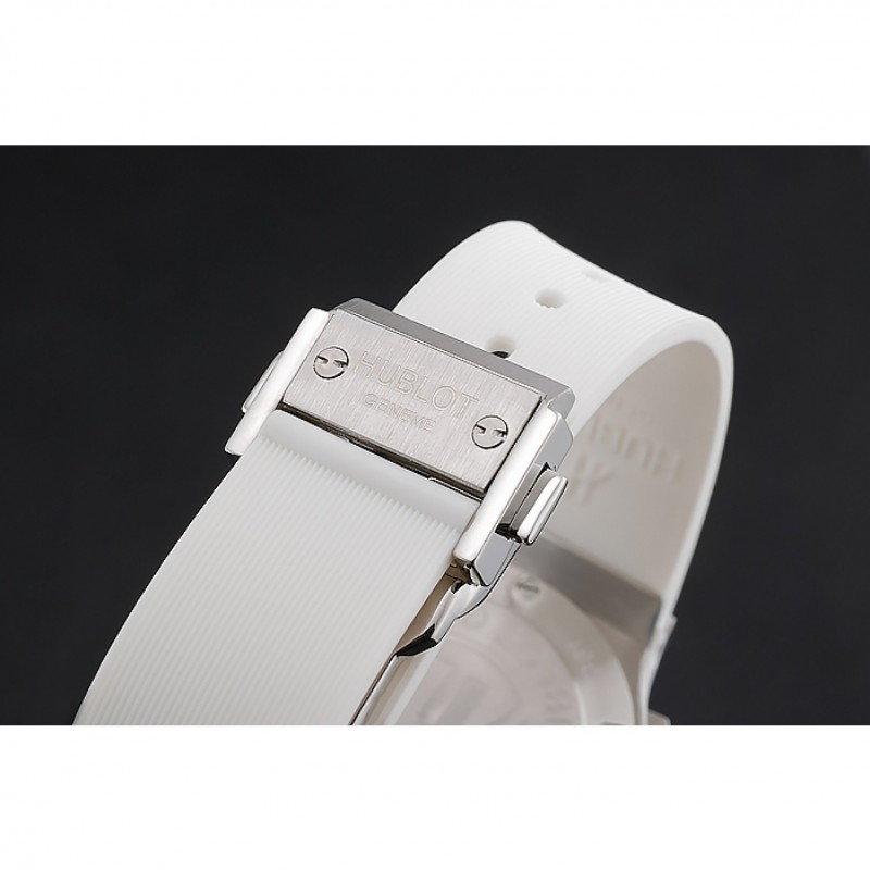 Crown: Cutwork cepillado corona de acero inoxidable con el grabado ‘H’ y dos coronas de pulsador rectangulares en cada lado, todo tachonada con guarniciones de goma blanca