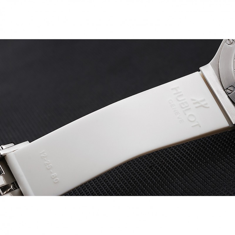 pulsera : banda de goma gris con textura de acero inoxidable cepillado broche de botón gancho y grabados Hublot