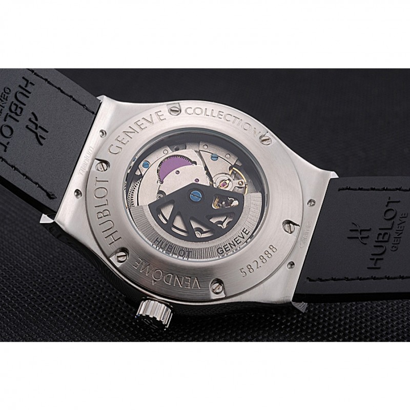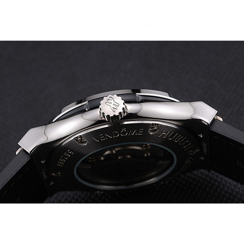 Volver:acero inoxidable cepillado atornillado de nuevo con la mecánica transparentes revelando centro y grabados Hublot Geneve