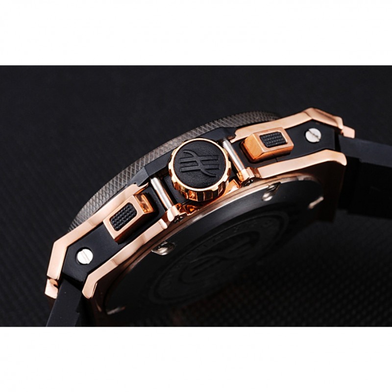Crown: Rose-chapado en oro corona cutwork con Hublot espárrago caucho logo y el perno de goma de pulsador coronas-oro se levantó en cada lado de ella
