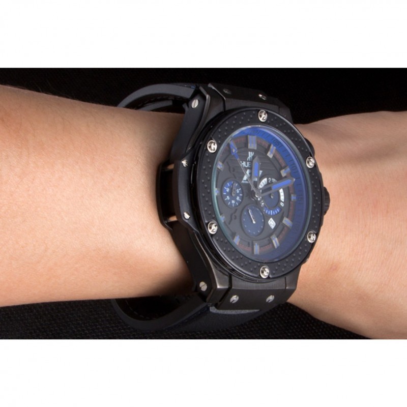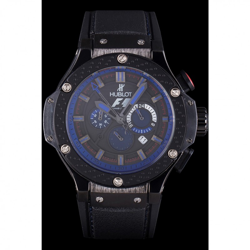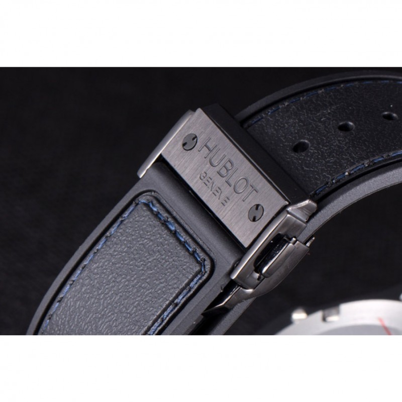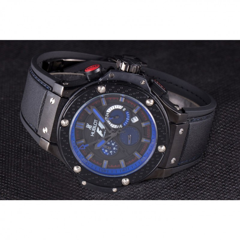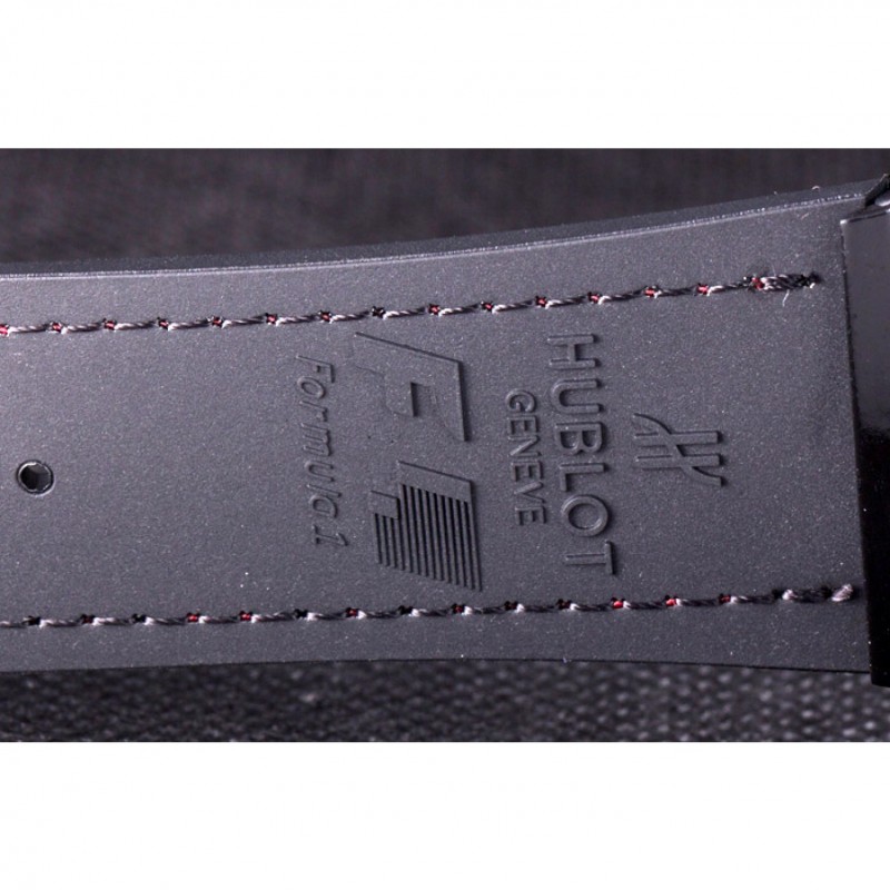 pulsera : correa de caucho negro con textura de calor Hublot Geneve F1 en relieve con la costura de hilo azul y Hublot Geneve grabado ion-plateado push-liberación gancho corchete