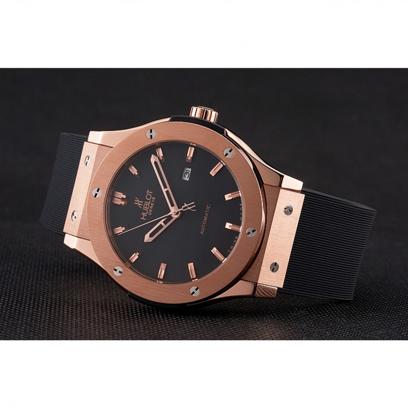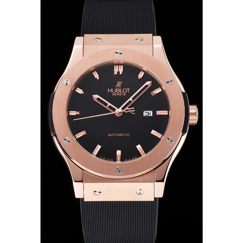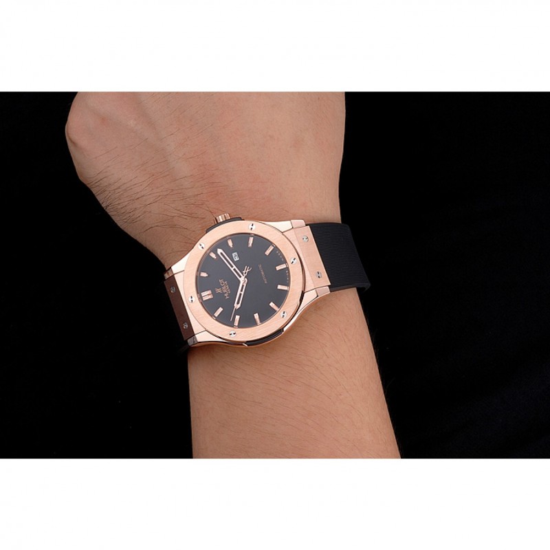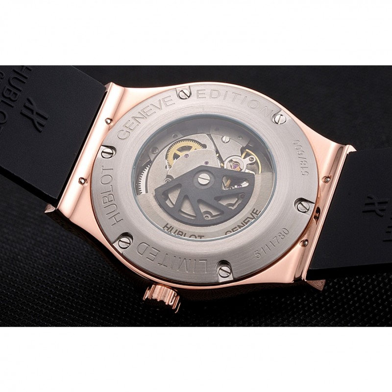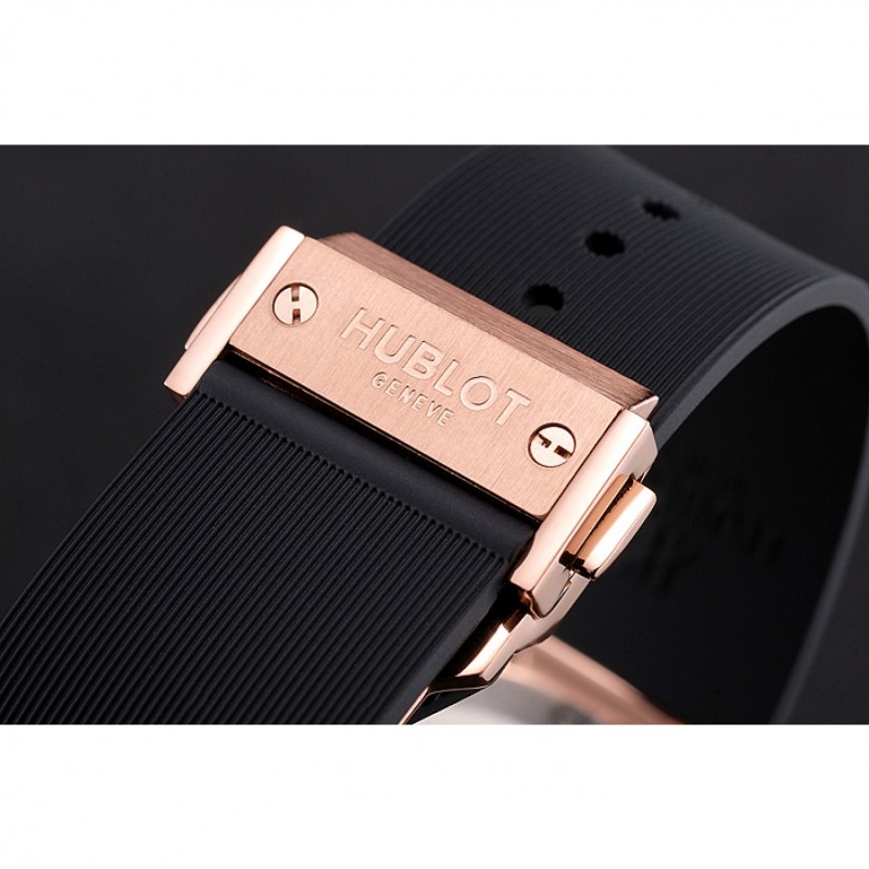 pulsera: calor Hublot Geneve correa de caucho negro en relieve línea de ranura con Hublot Geneve grabado 18K rose-chapado en oro empujar de liberación gancho corchete