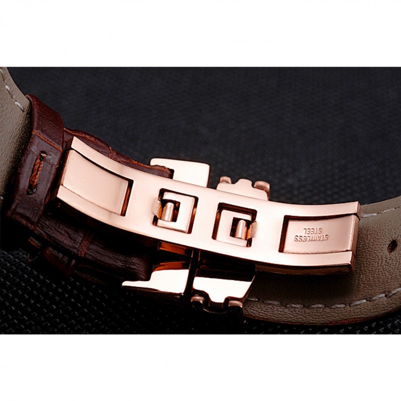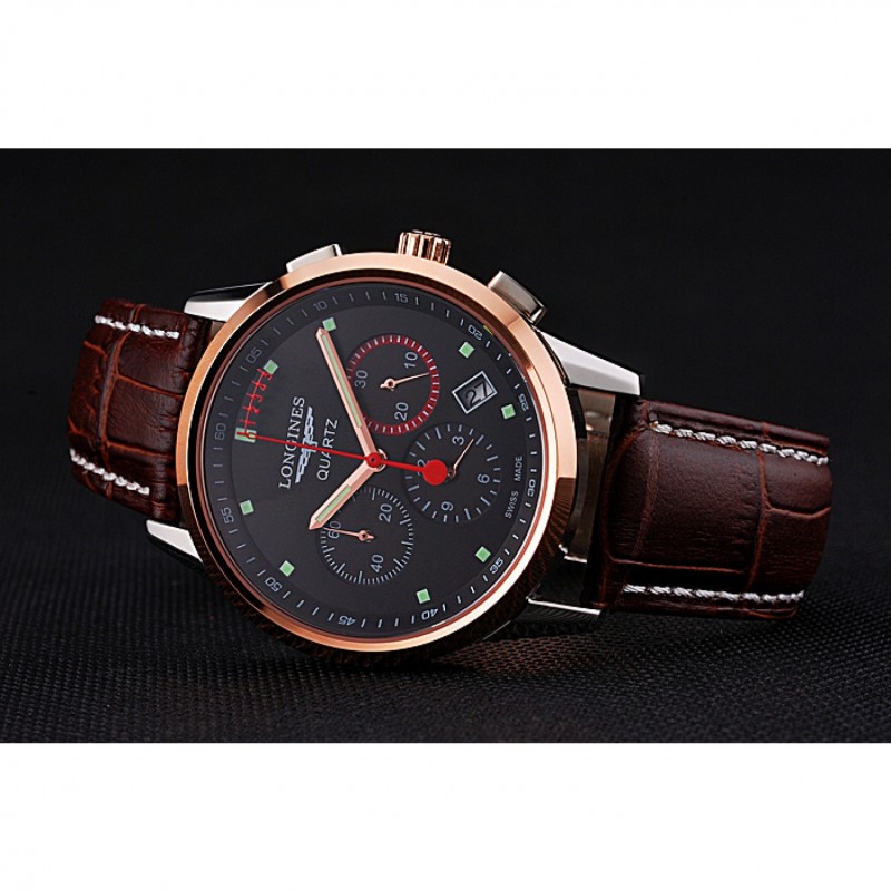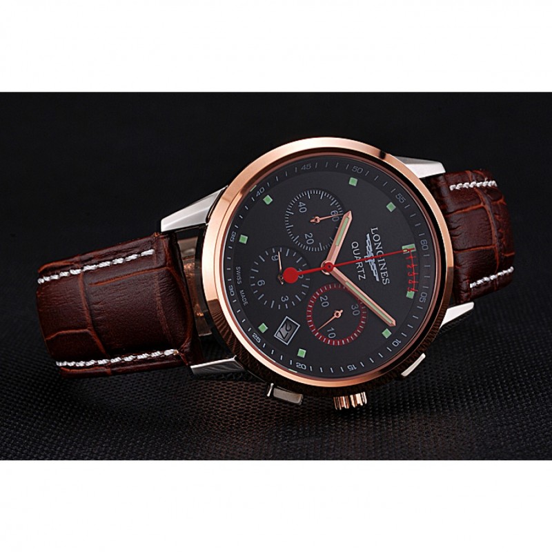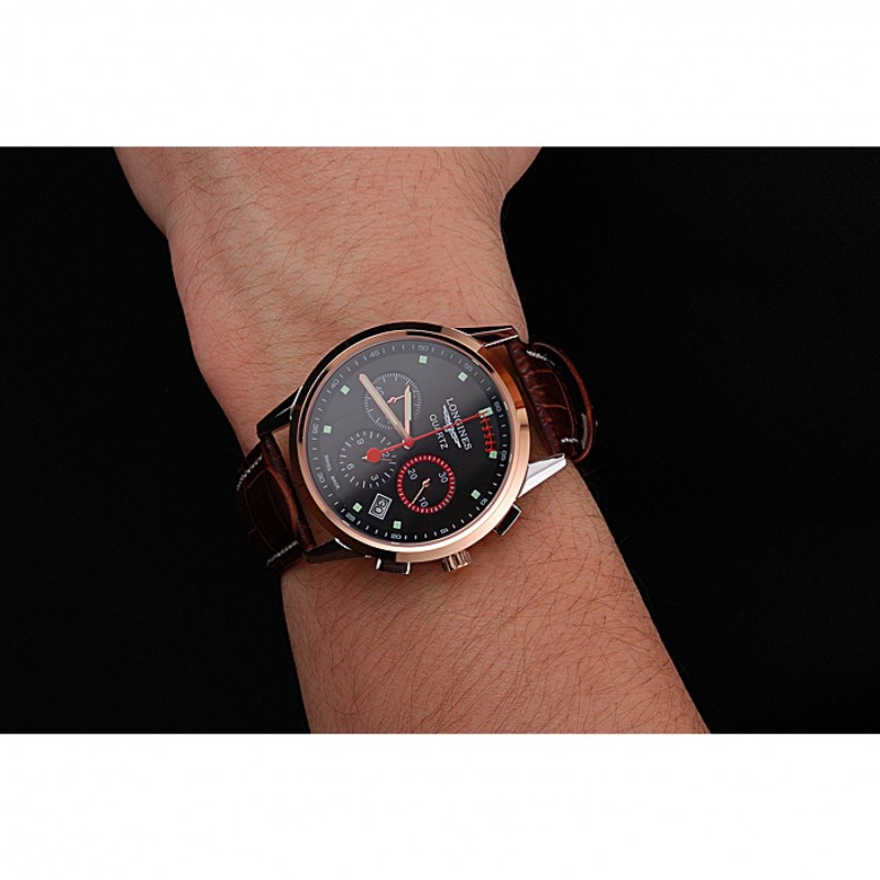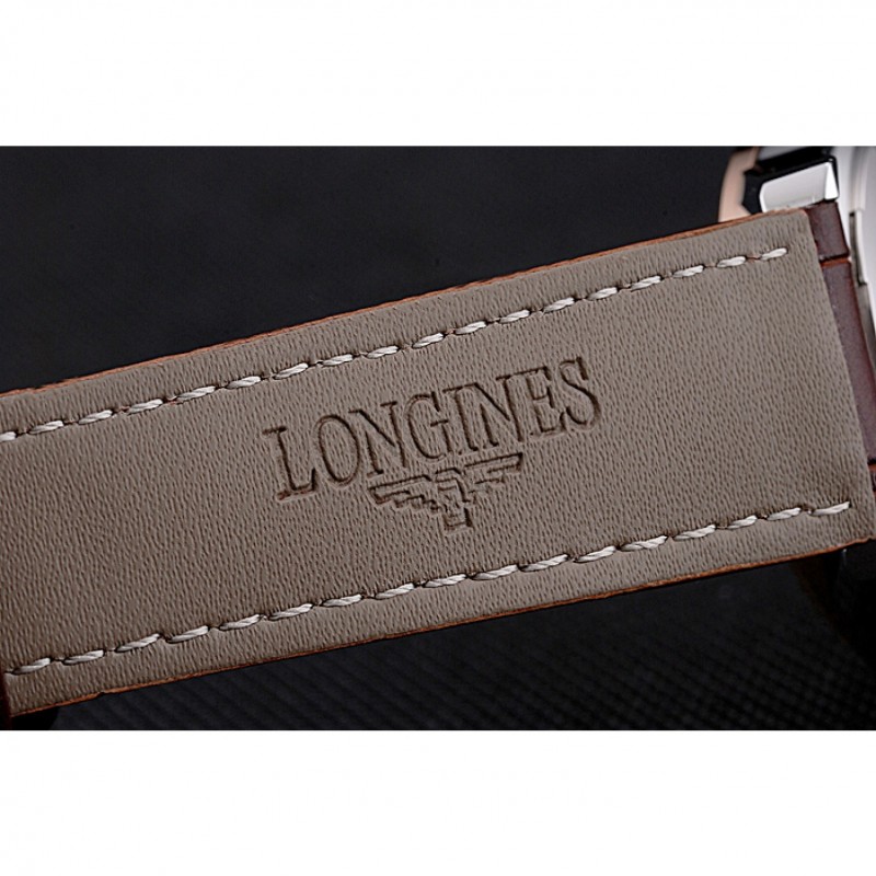 pulsera: logotipo y correa de cuero Longines de calor en relieve de cocodrilo marrón con costuras de hilo blanco y el logotipo y Longines grabado rosa de 18 quilates chapado en oro hebilla de cierre