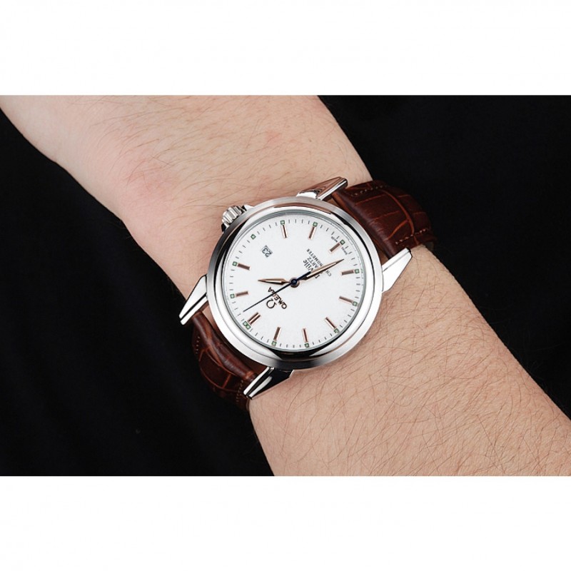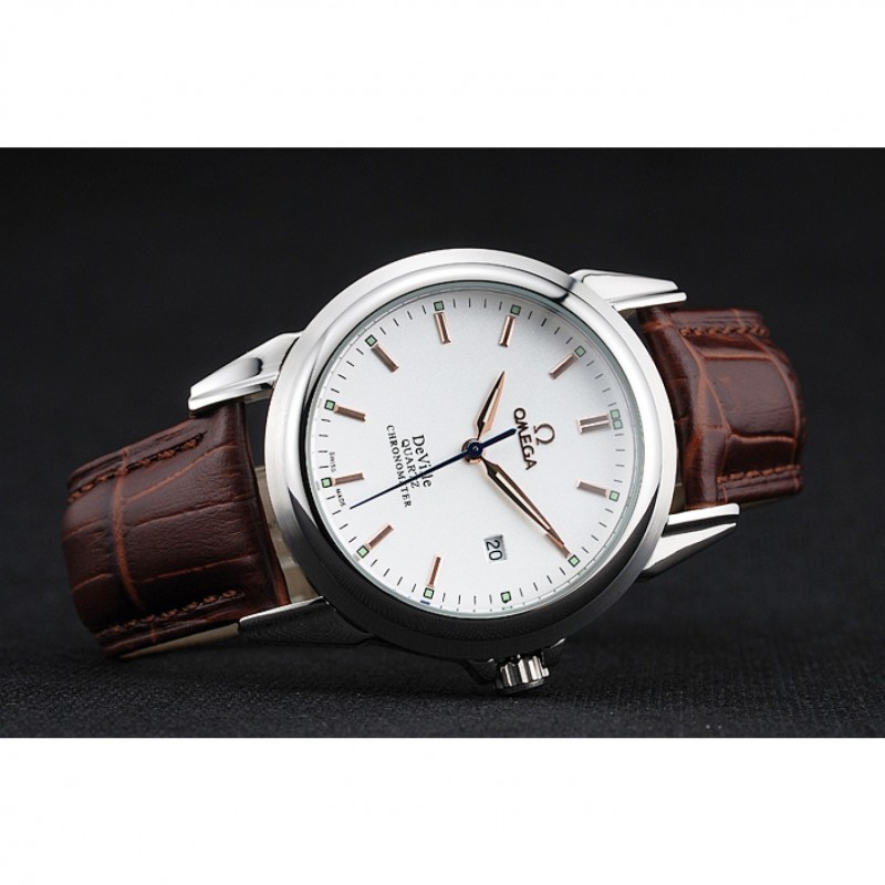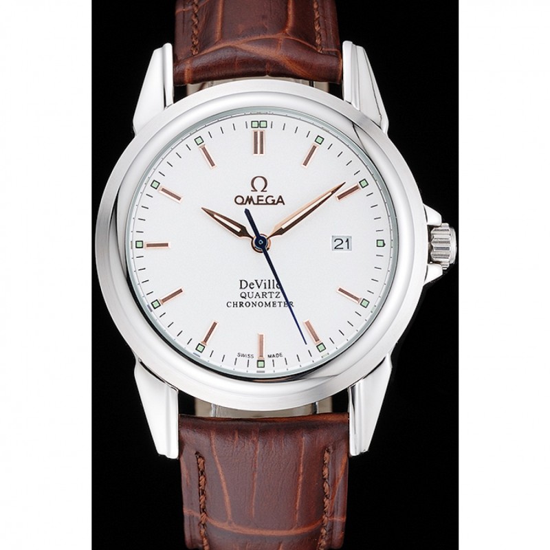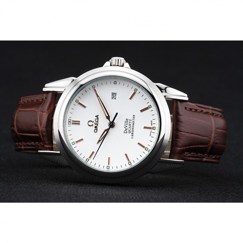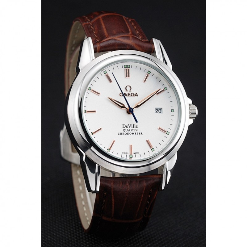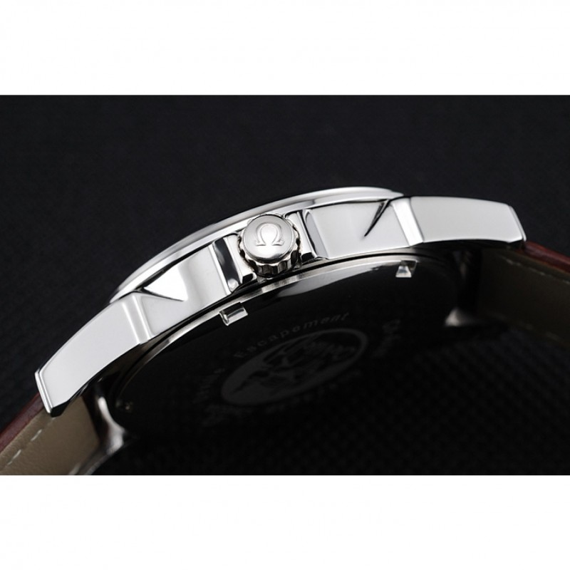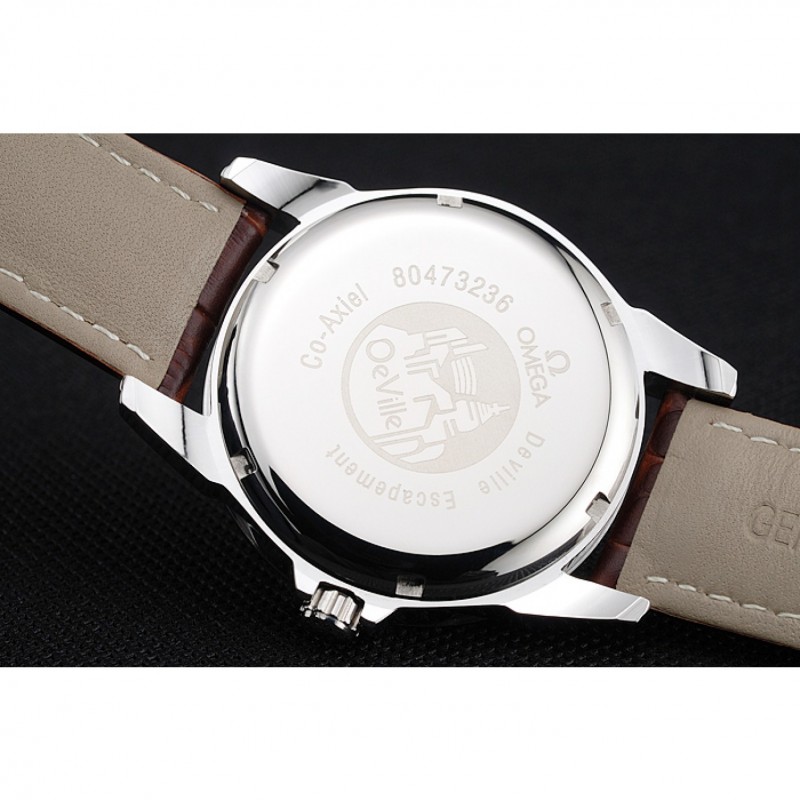 pulsera: de acero inoxidable correa de piel de cocodrilo marrón con costuras blancas y el logotipo de Omega grabado gancho hebilla de cierre