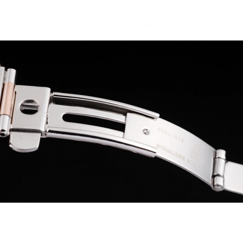SKU: Omega 05090282 Categorías: Constellation, Omega Etiquetas: 160 x 16 mm, 18k corona cutwork oro rosa con el logotipo de Omega, 26 x 25 mm, 8 mm, Acero inoxidable, bisel de oro rosa con negro marcadores de hora de número romano, Constellation, Cristal de Zafiro, Cuarzo (Batería), De dos colores, ETA Suizo, Mujeres, Omega