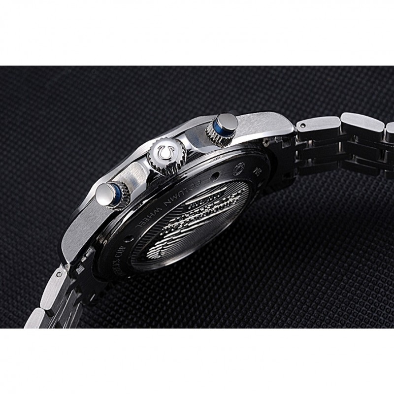 Corona: logo Omega grabado pulido corona cutwork de acero inoxidable con la tira de esmalte negro pulsador ronda corona en cada lado de ella, más un logo grabado pulido corona cutwork de acero inoxidable en la parte superior esquina opuesta
