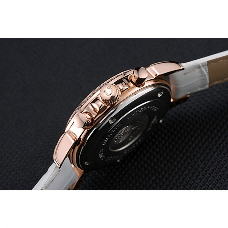 corona:corona18k logo Omega grabado de oro rosa con una ronda corona pulsador a cada lado de ella