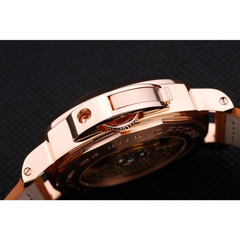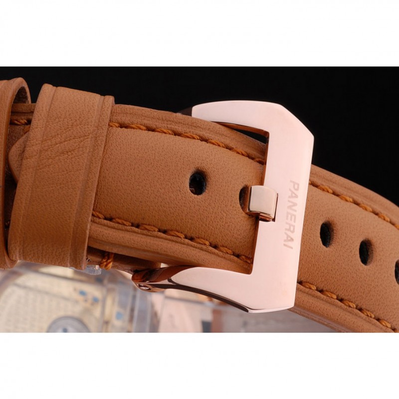 Volver: 18k oro amarillo caso plateado con grabados Panerai y un centro transparente que revela la mecánica dentro de