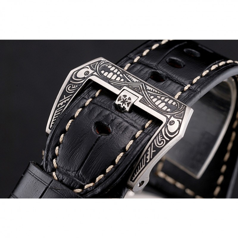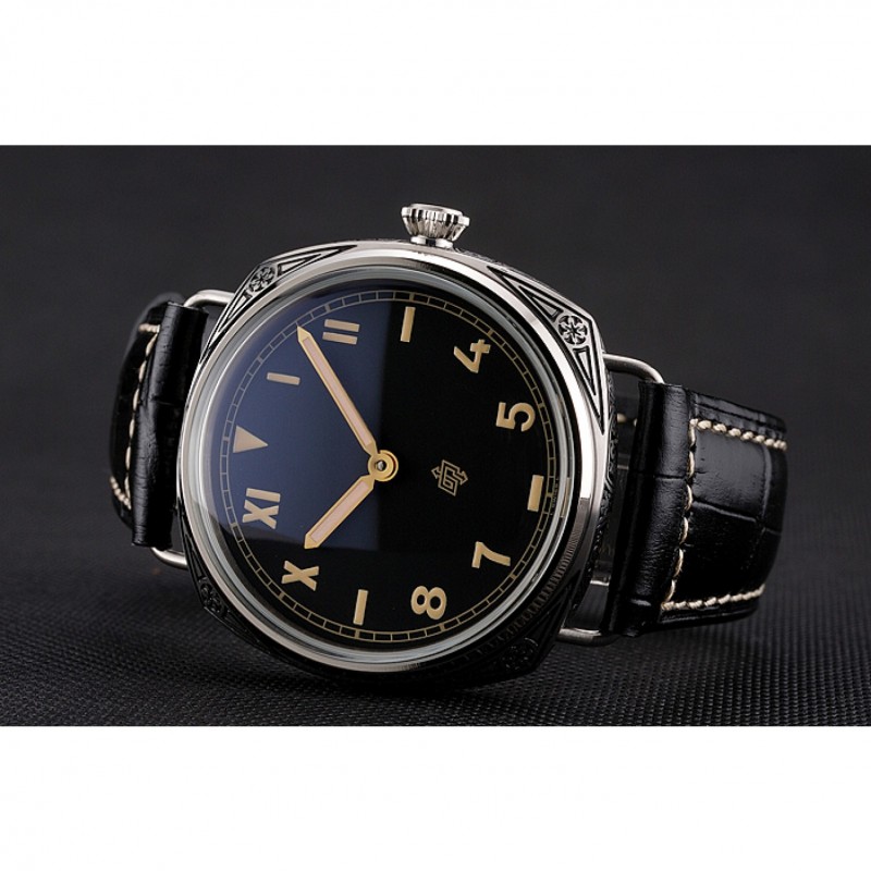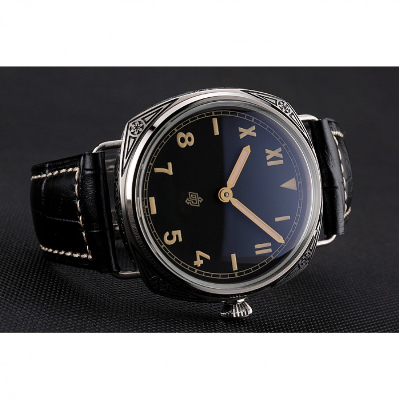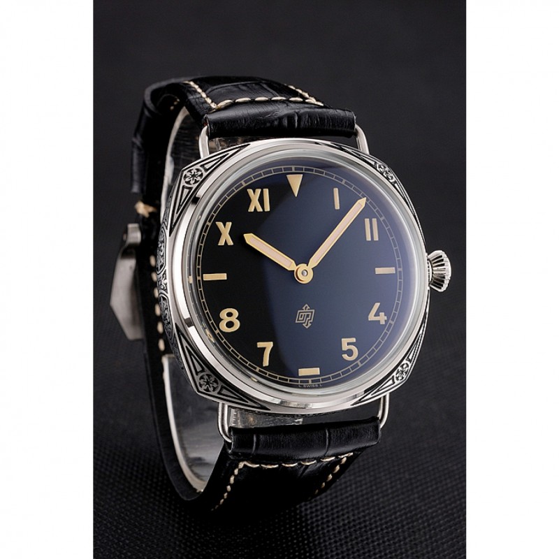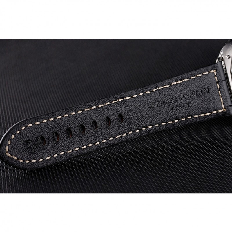 pulsera: correa de piel de cocodrilo negro Officine Panerai Italia calor en relieve con hilo blanco costura y tallada acero inoxidable cepillado gancho hebilla de cierre