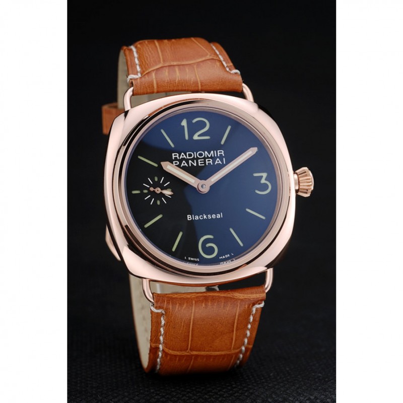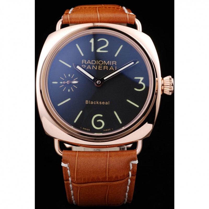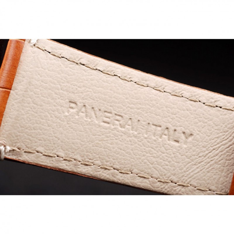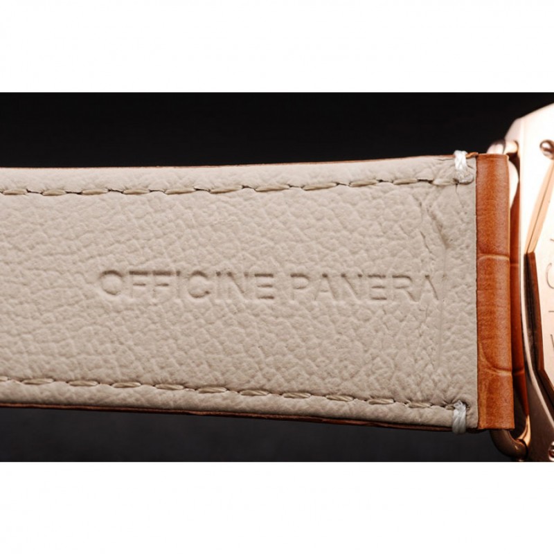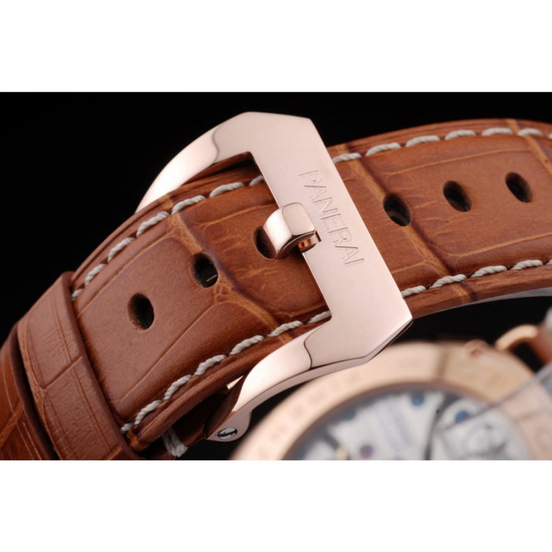 pulsera: correa de piel de cocodrilo marrón con costuras blancas y el calor en relieve sello de Officine Panerai Italia y rosa de 18 quilates chapado en oro broche de gancho hebilla con Panerai grabado