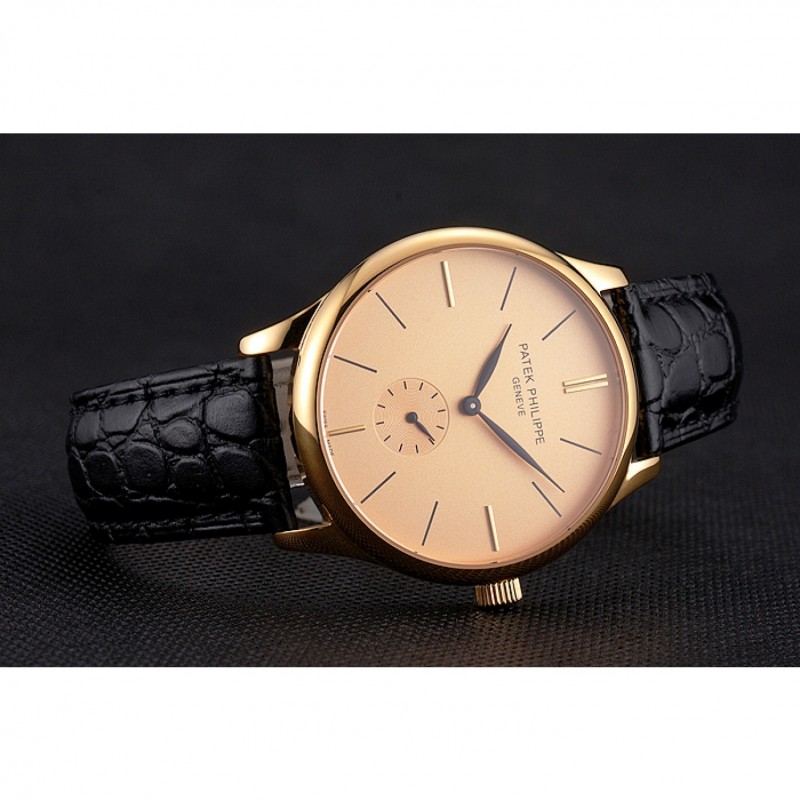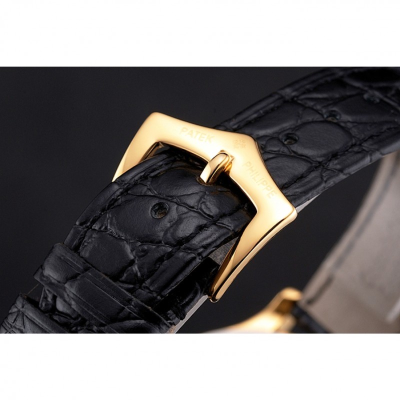 pulsera: Patek Philippe y logo correa de piel de cocodrilo negro en relieve de calor con Patek Philippe y el logotipo inscrito 18k oro amarillo plateado gancho hebilla de cierre
