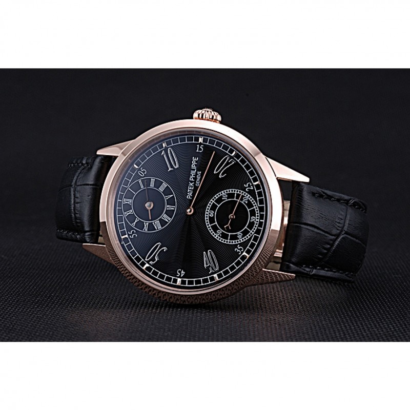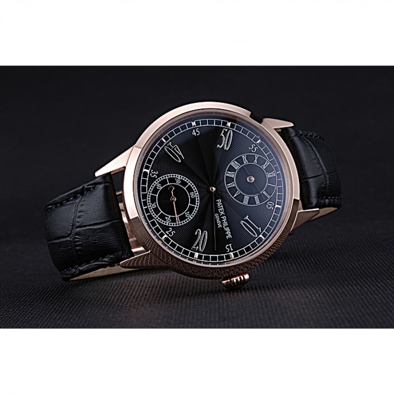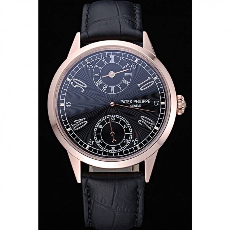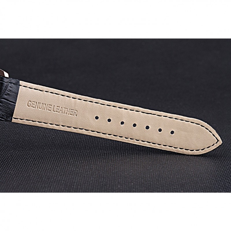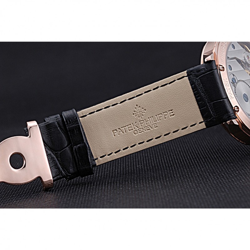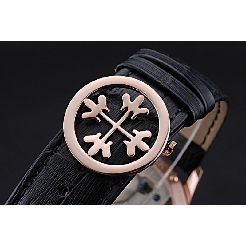 pulsera: logotipo y correa de cuero Patek Philippe Geneve calor en relieve de cocodrilo negro con rosa de 18 quilates chapado en oro calado logotipo corchete del gancho