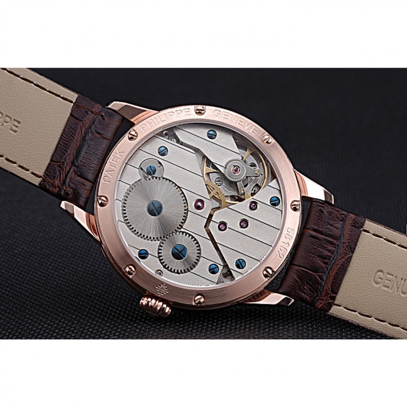Volver: 18k Rose- chapado en oro atornillada de nuevo con la mecánica transparentes revelando centro y Patek Philippe Geneve grabado