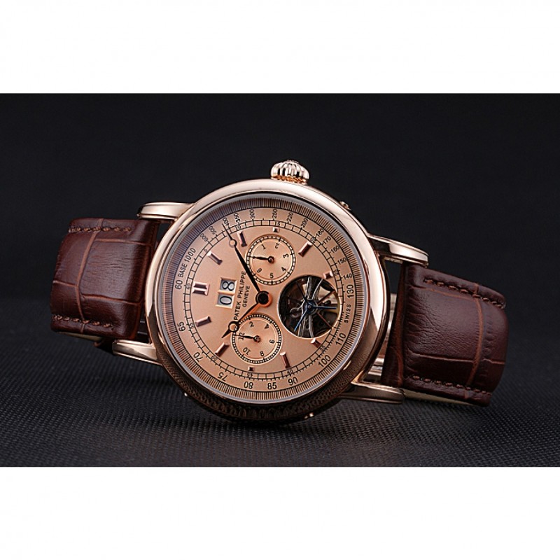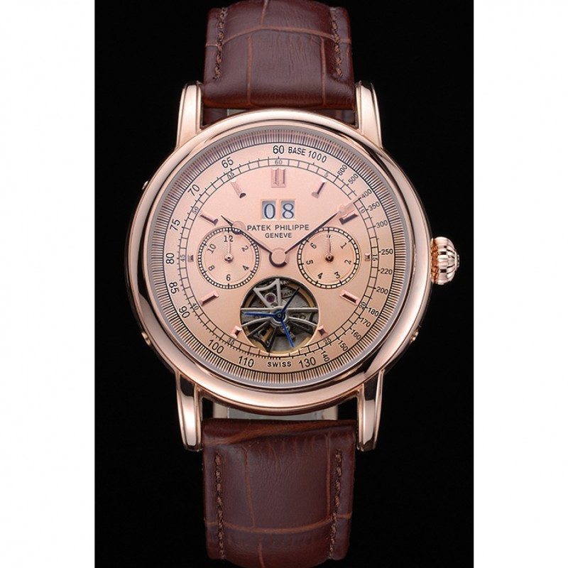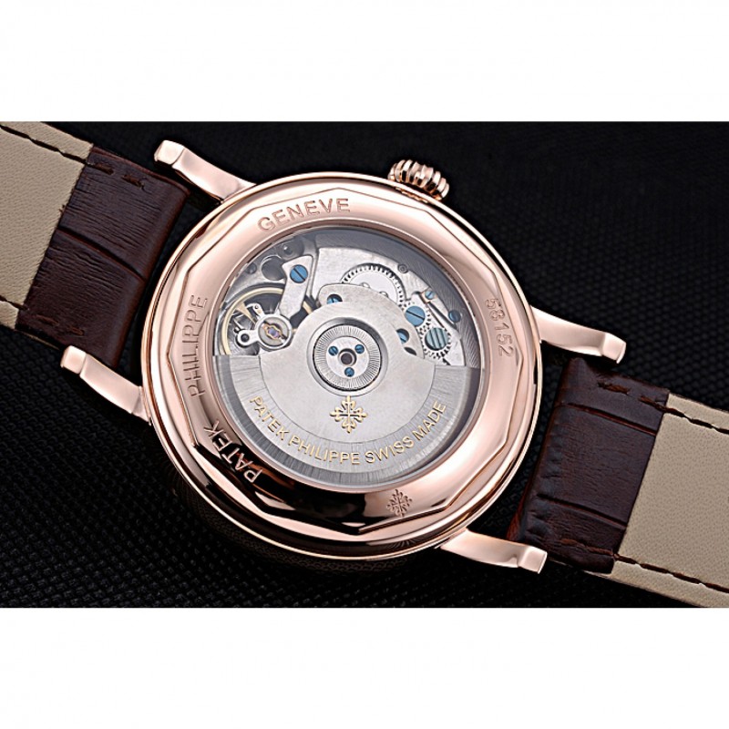 Volver: 18k Rose- chapado en oro complemento en la parte trasera con la mecánica transparentes revelando centro y Patek Philippe Geneve grabado