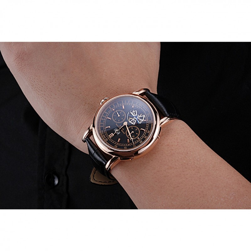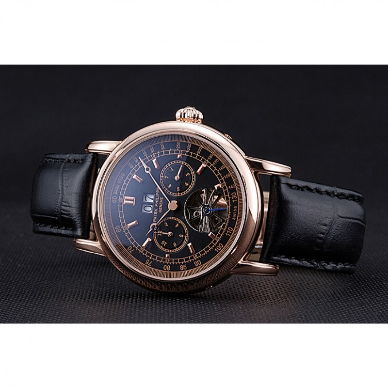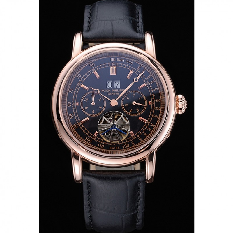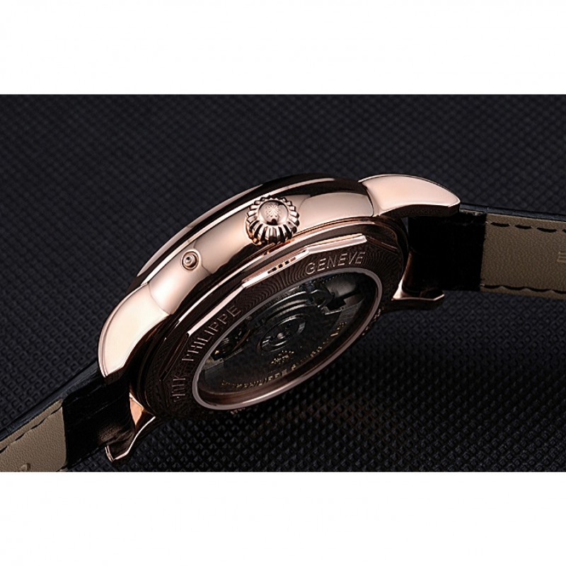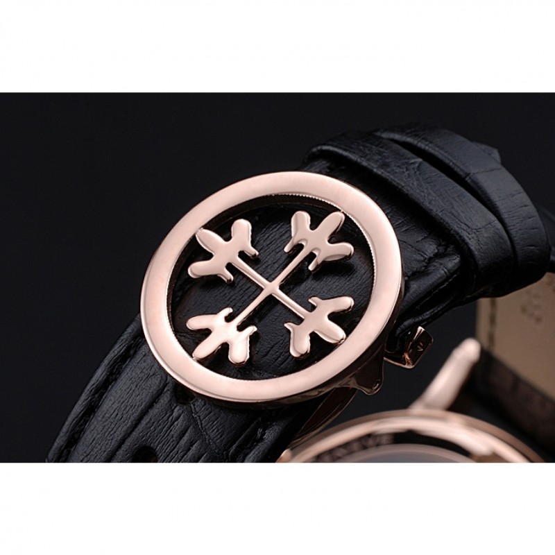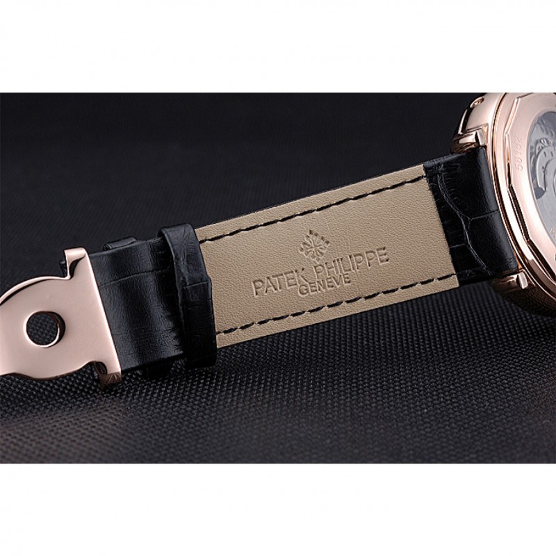 pulsera: logotipo y correa de cuero Patek Philippe Geneve calor en relieve de cocodrilo negro con rosa de 18 quilates chapado en oro calado logotipo corchete del gancho