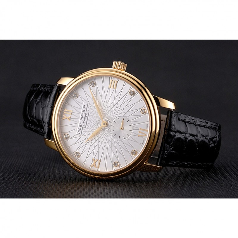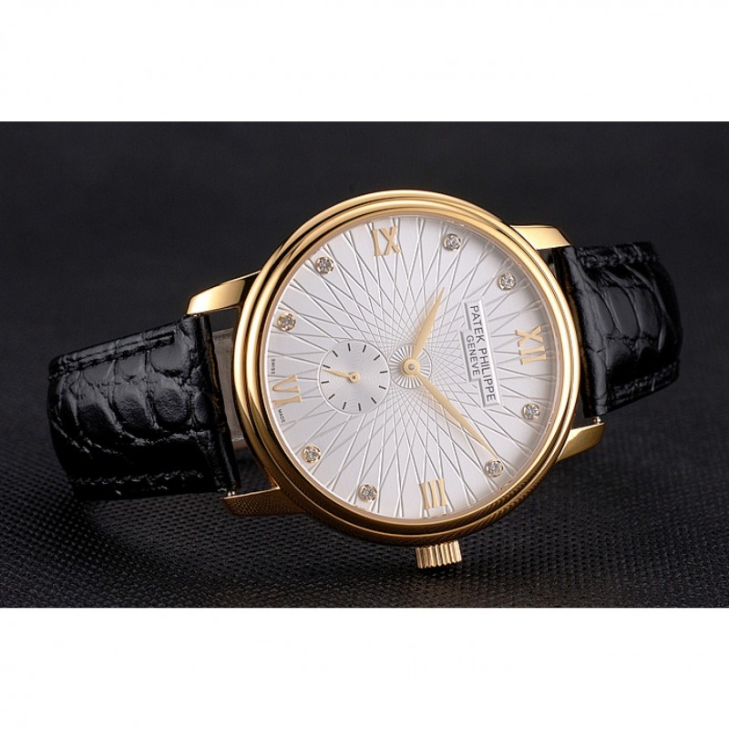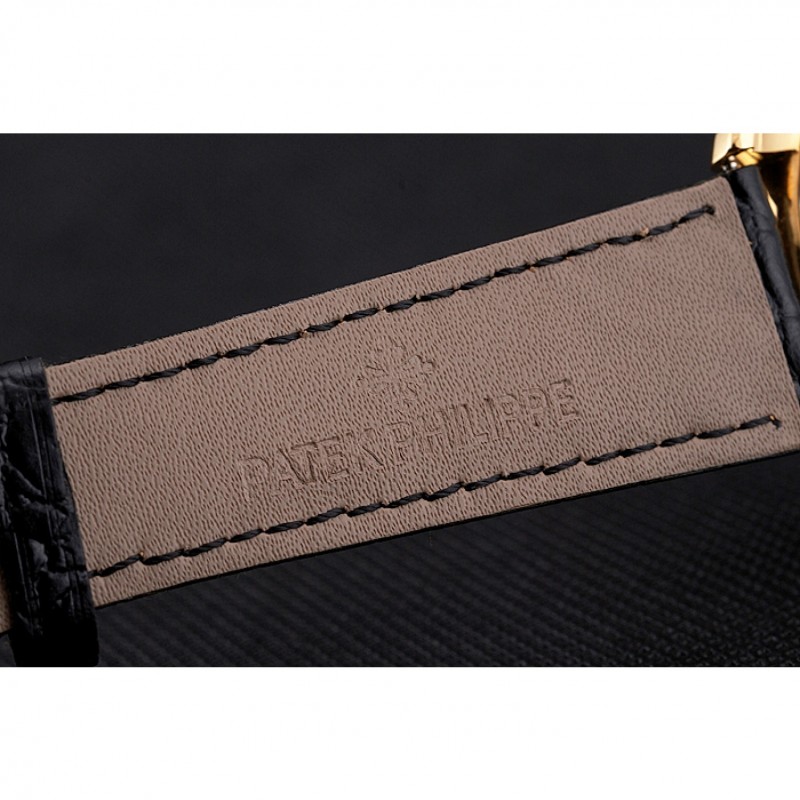 pulsera: Patek Philippe y logo correa de piel de cocodrilo negro en relieve de calor con Patek Philippe y el logotipo inscrito 18k oro amarillo plateado gancho hebilla de cierre