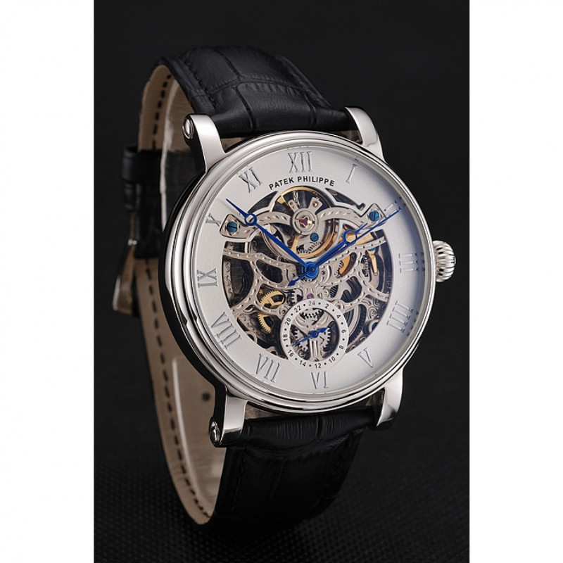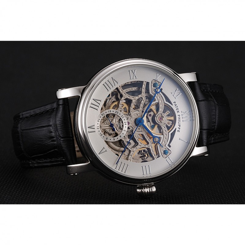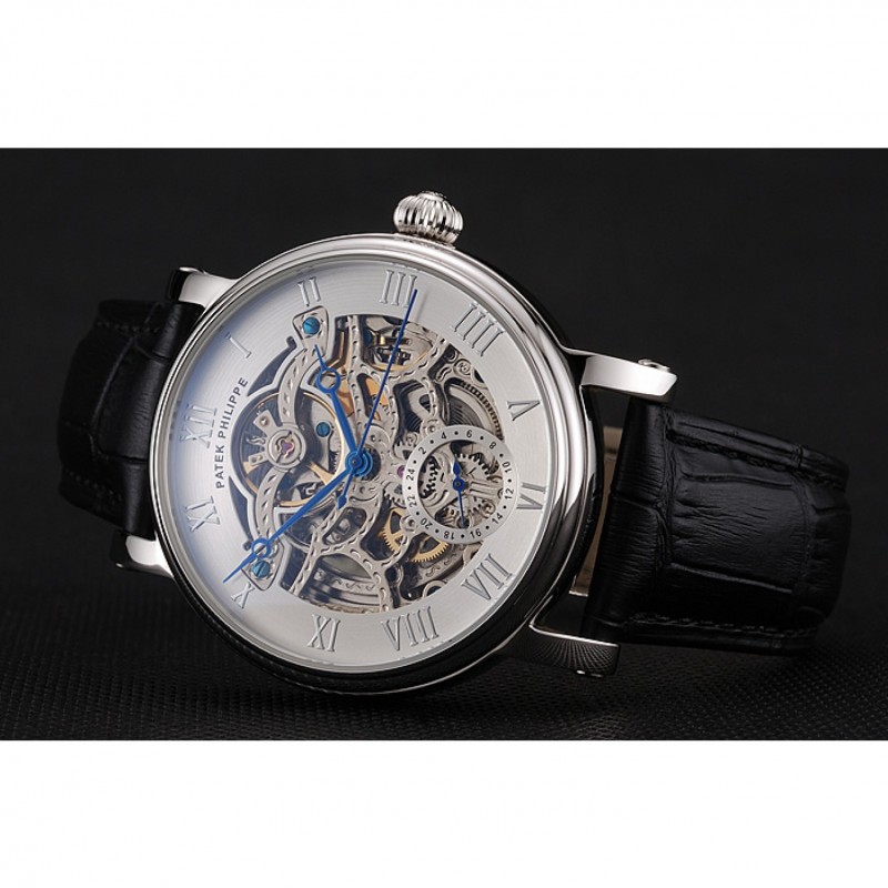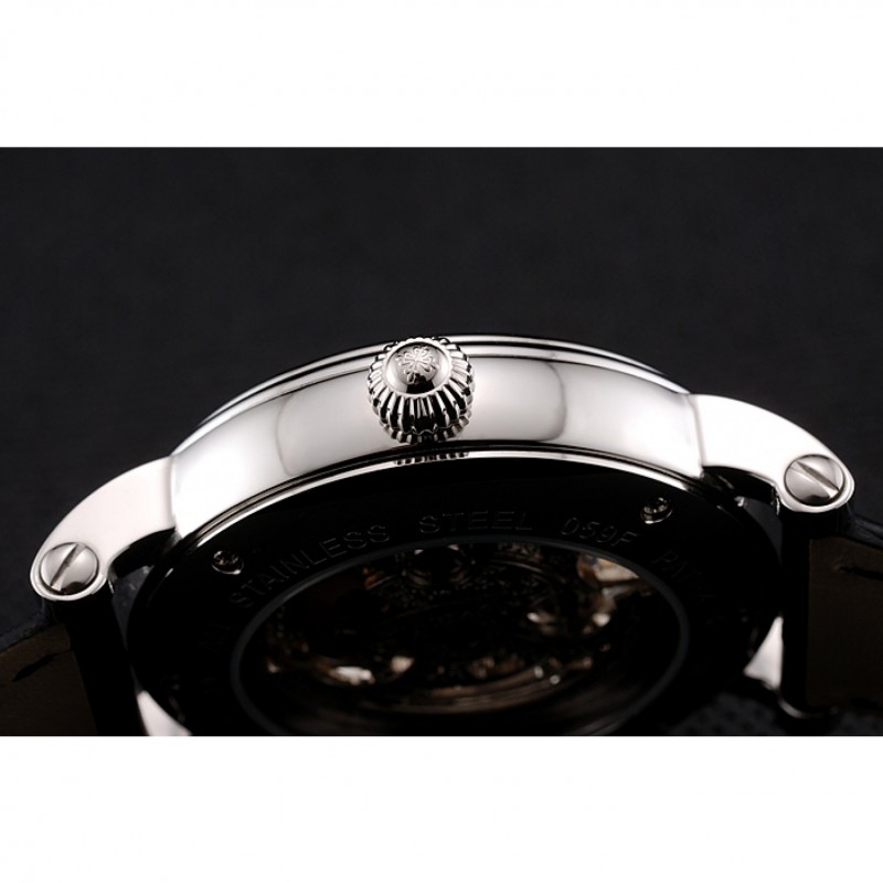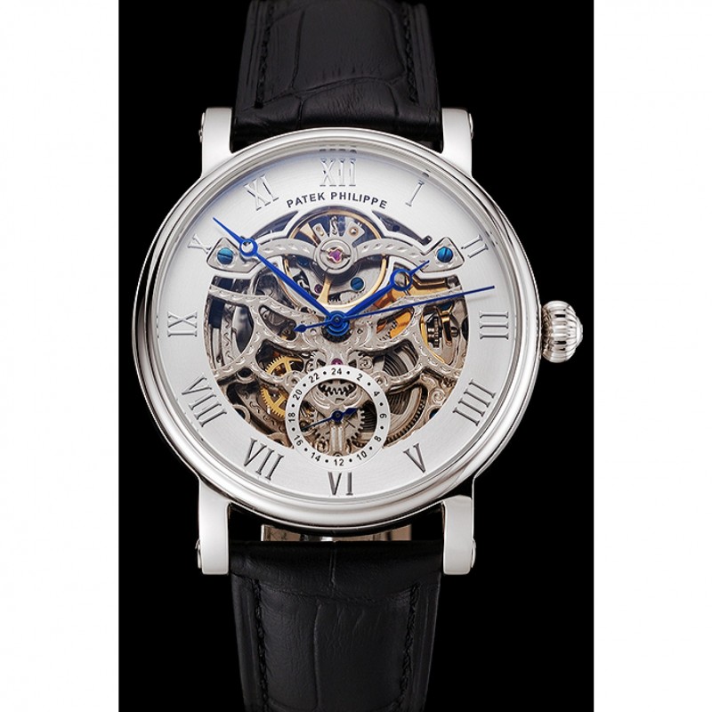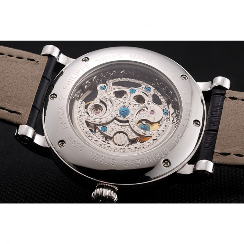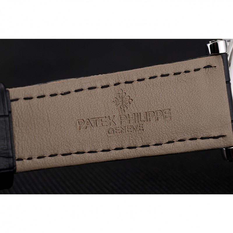 Patek Philippe Grand complicaciones blanca Esqueleto Dial caja de acero inoxidable Negro correa de cuero 1453810
