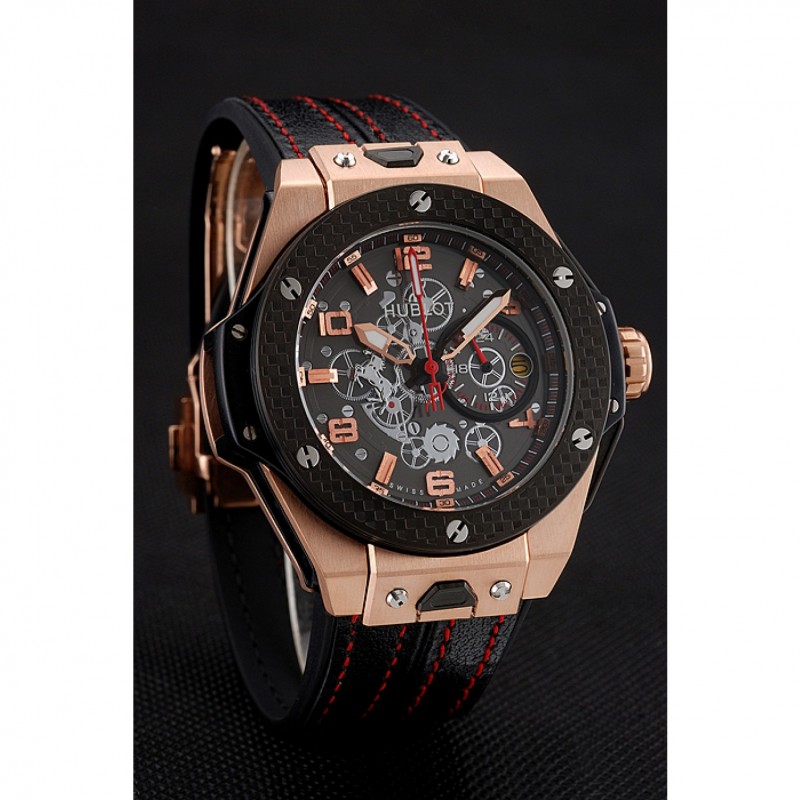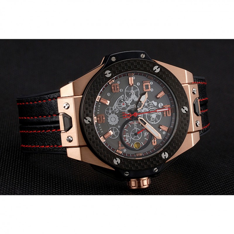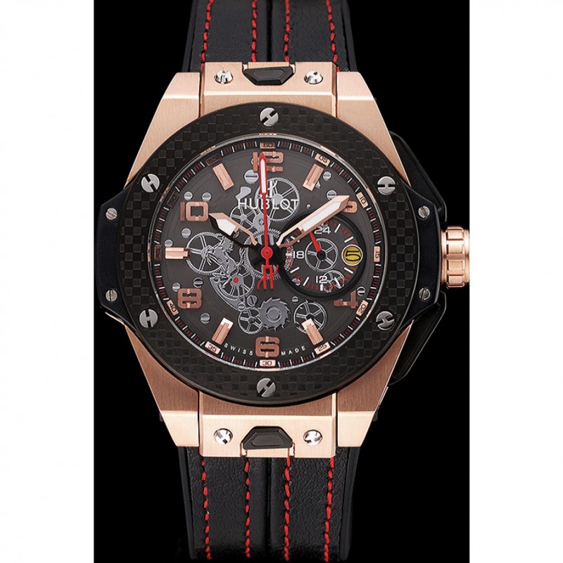 pulsera: Logo y correa de cuero Hublot Geneve calor en relieve negro con costuras hilo rojo y Hublot Geneve grabado 18K rose-chapado en oro empujar de liberación broche de gancho