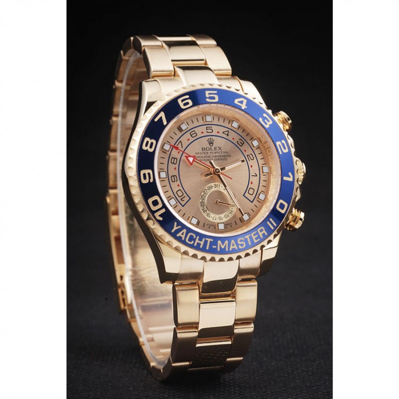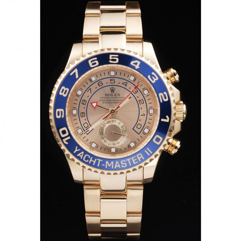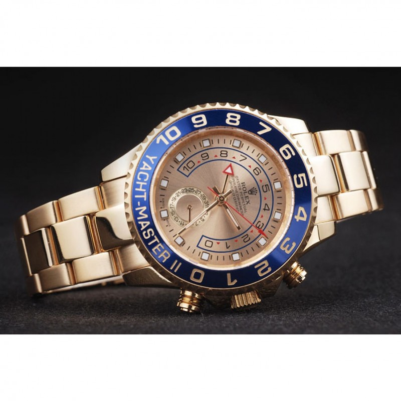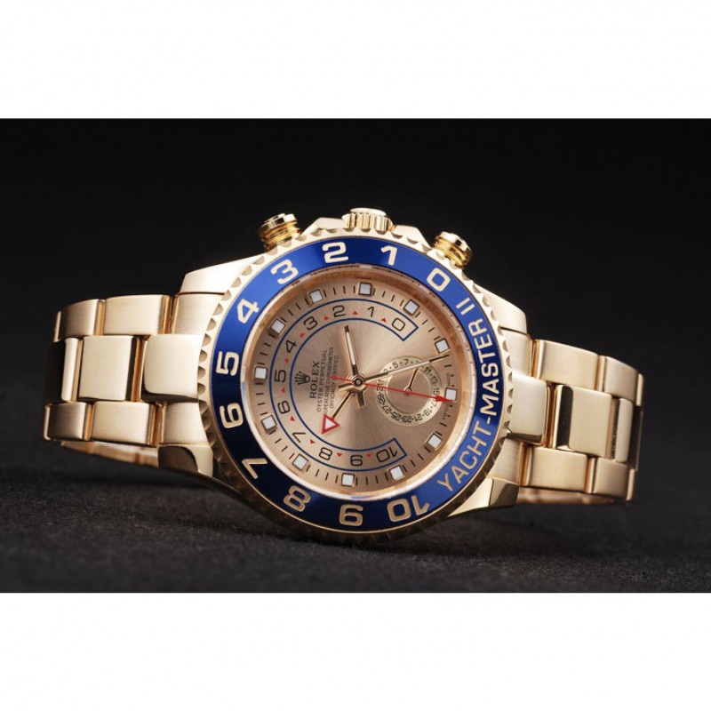 bisel: chapado en oro bisel cutwork unidireccional con 1 a 10 marcas y Yacht Master grabado sobre un fondo esmaltado azul