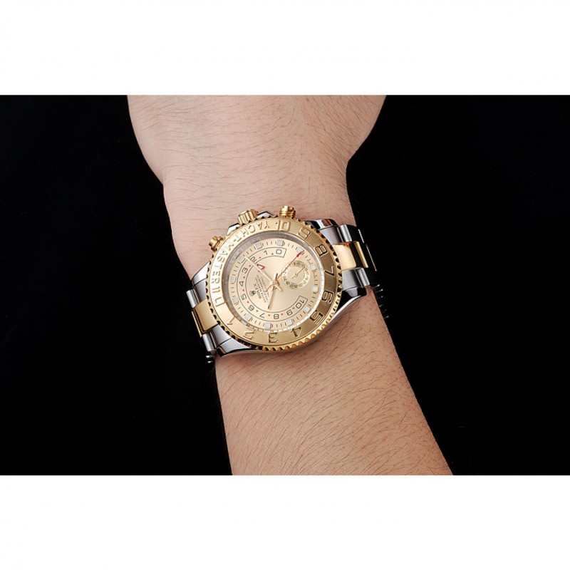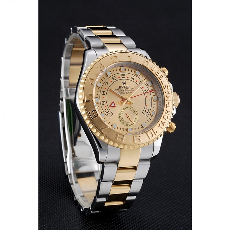 Bisel: Chapado en oro bisel unidireccional calado con 1 a 10 marcas y Yacht Master grabado sobre un fondo azul esmaltado