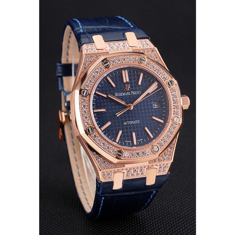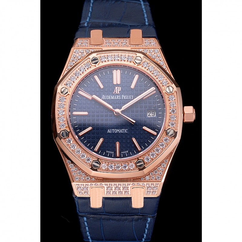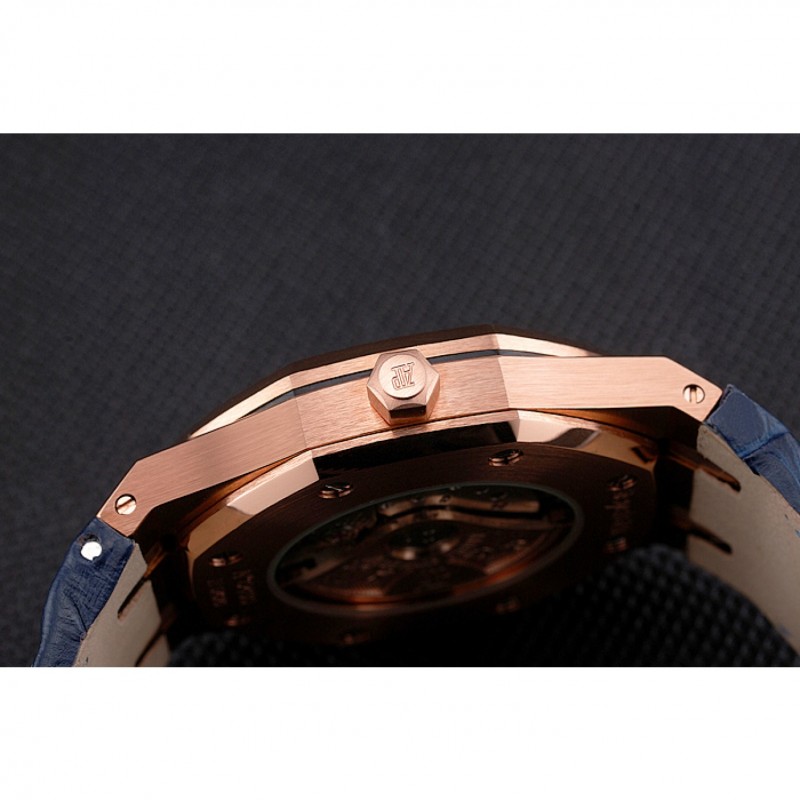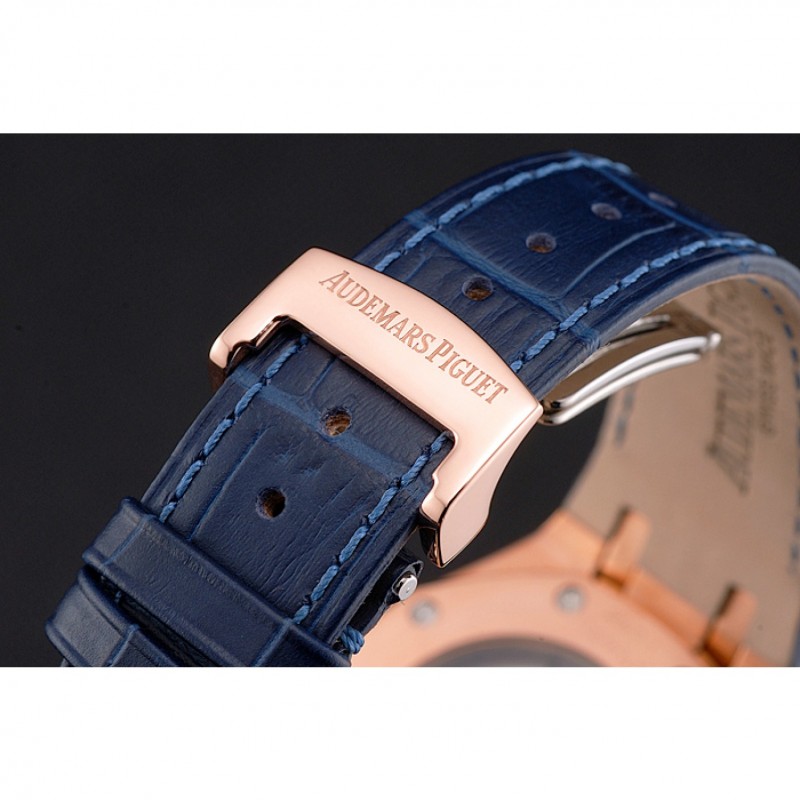 pulsera: correa de piel de cocodrilo azul en relieve de calor Royal Oak offshore con Audemars Piguet grabado rosa de 18 quilates chapado en oro del gancho del corchete