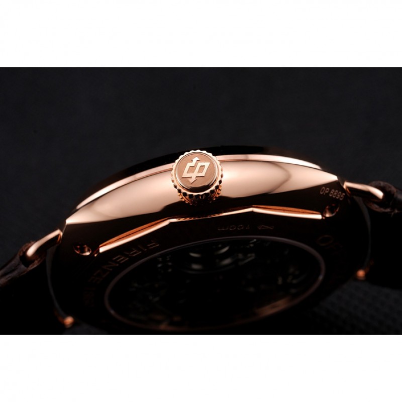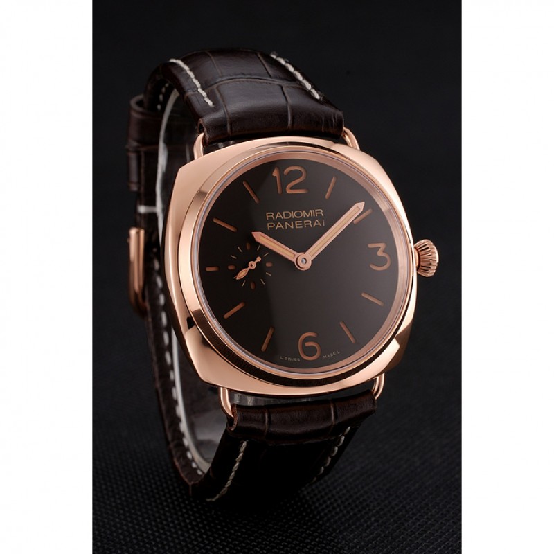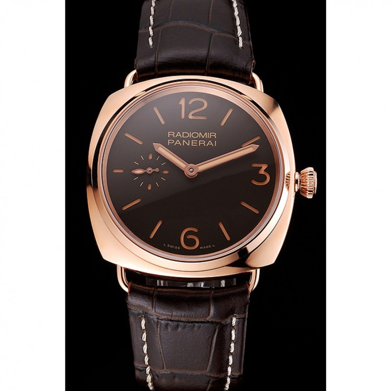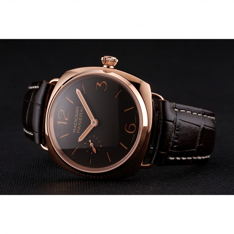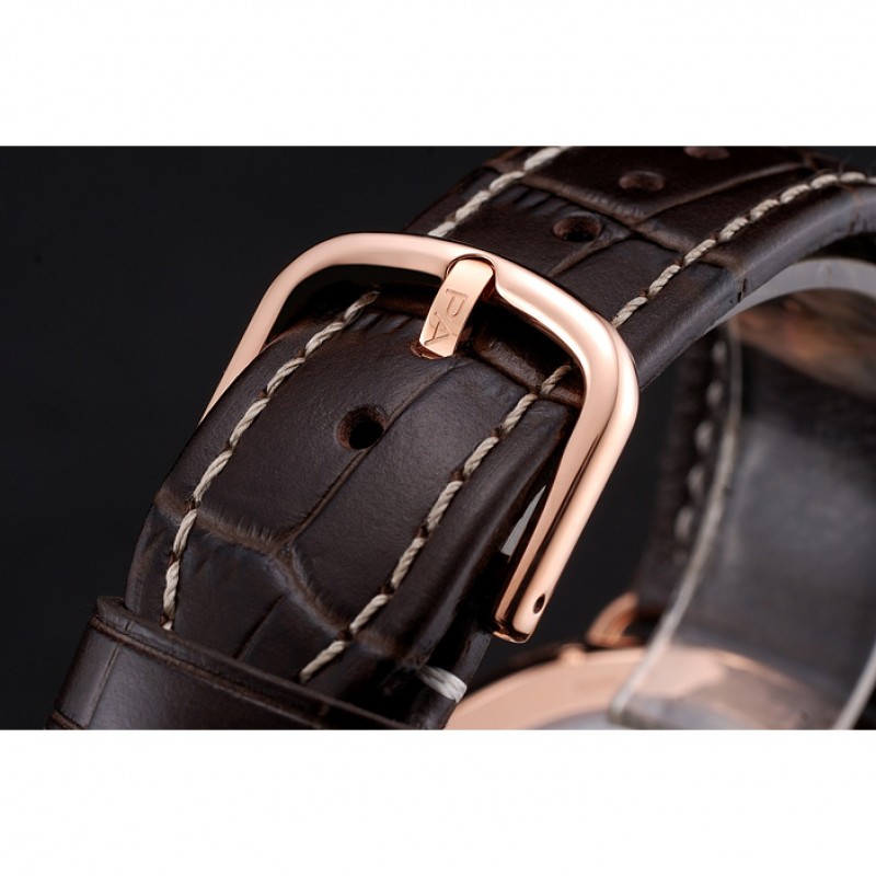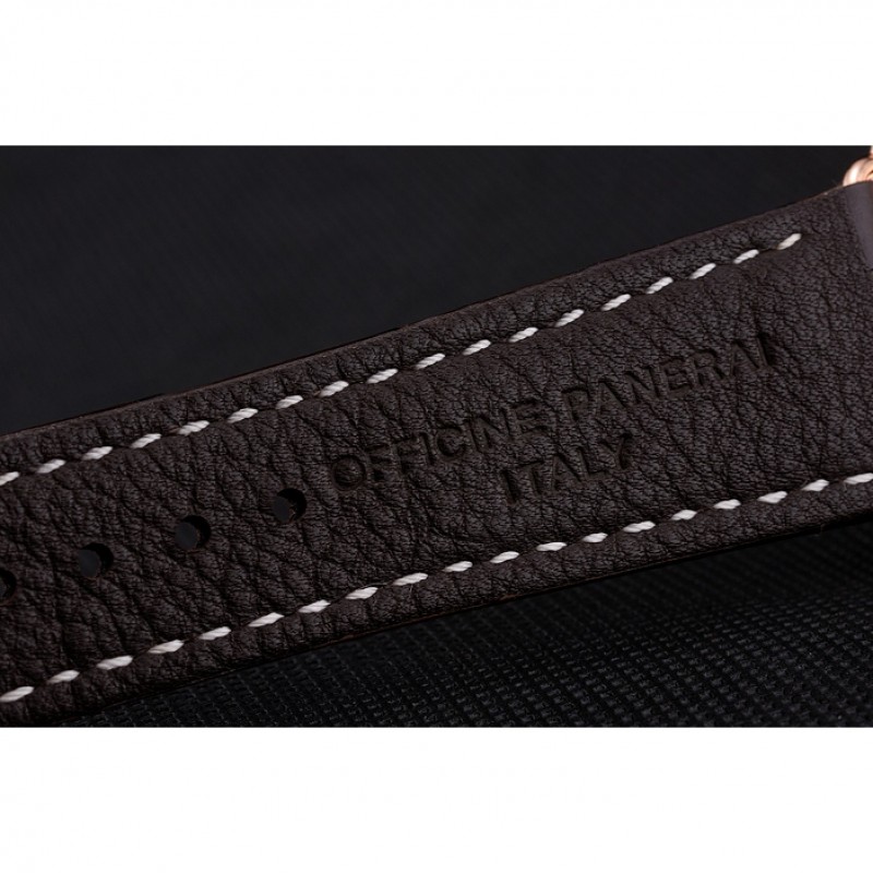 pulsera: Officine Panerai Italia calor en relieve correa de cuero de color marrón oscuro con costuras de hilo blanco y Panerai grabado rosa de 18 quilates chapado en oro gancho hebilla de cierre