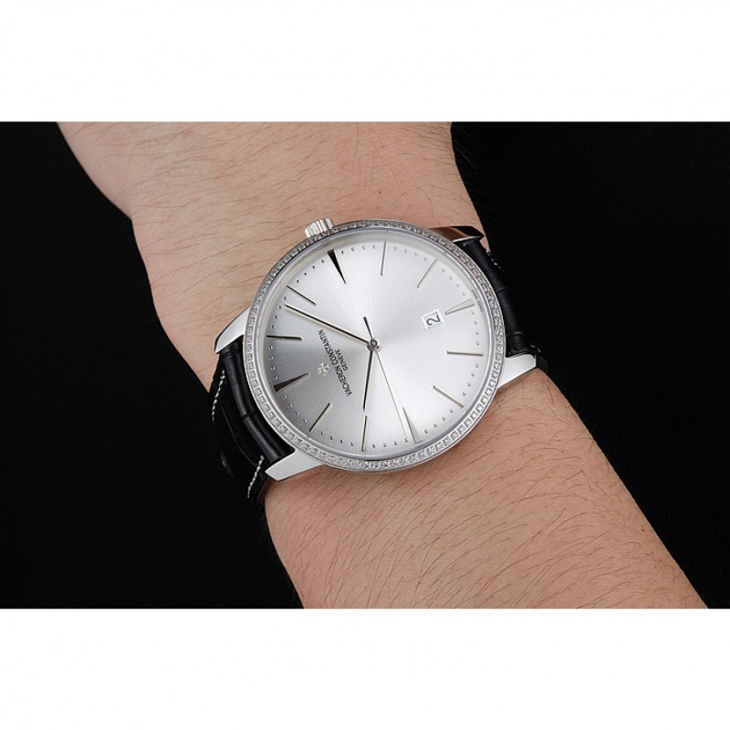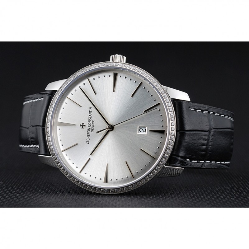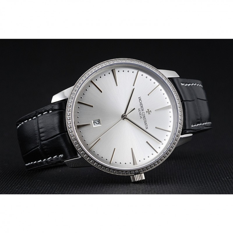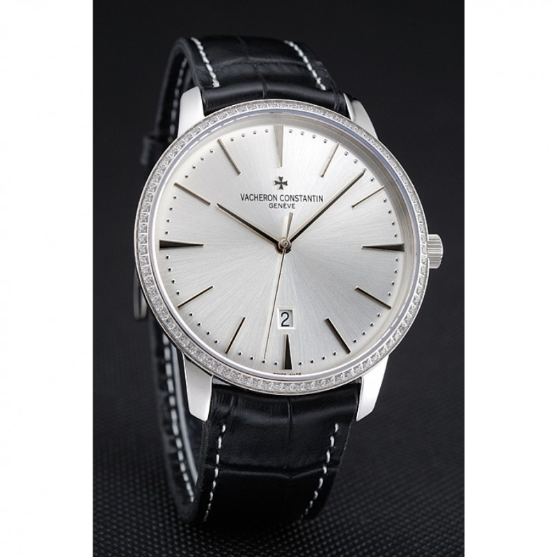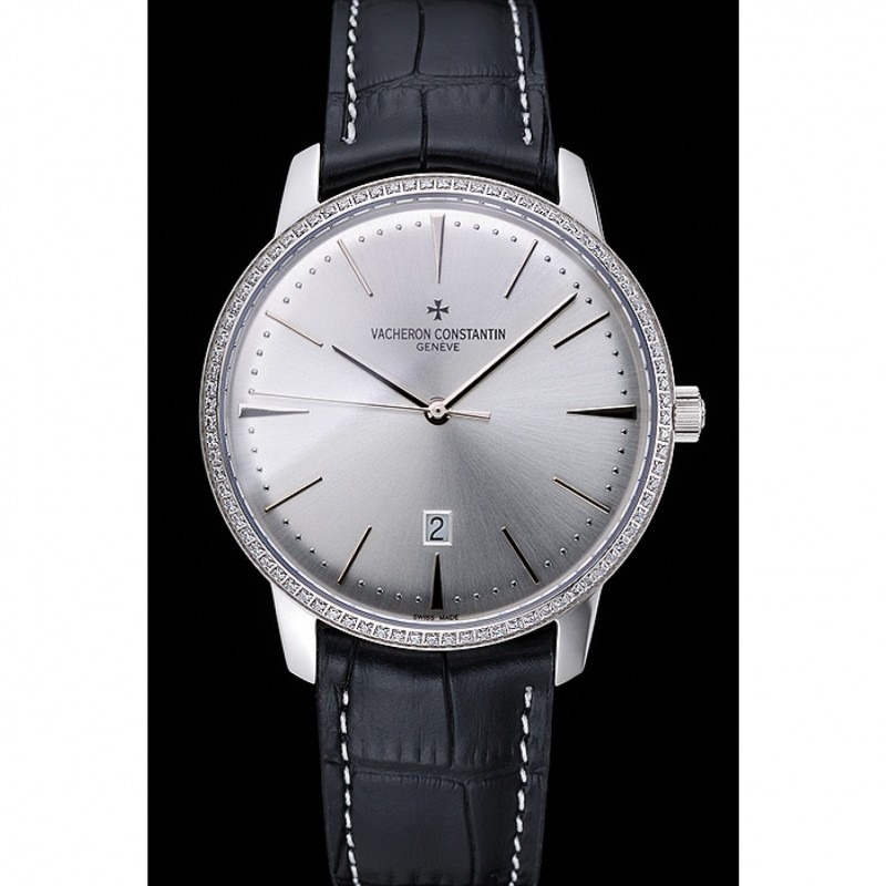 pulsera: Vacheron Constantin y correa de piel de cocodrilo negro calor logotipo en relieve con la costura de hilo blanco y logo Vacheron Constantin tallada de acero inoxidable pulido de gancho hebilla de cierre de