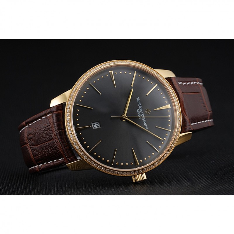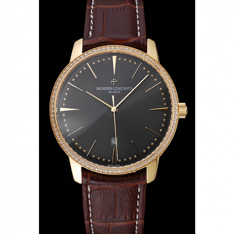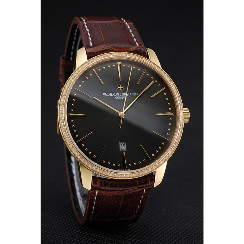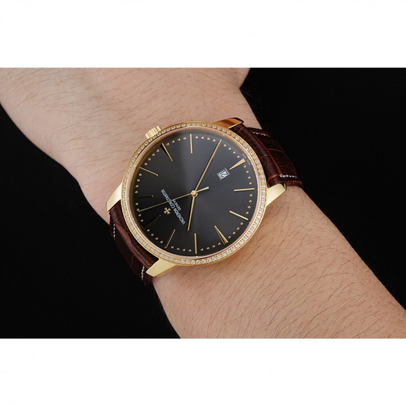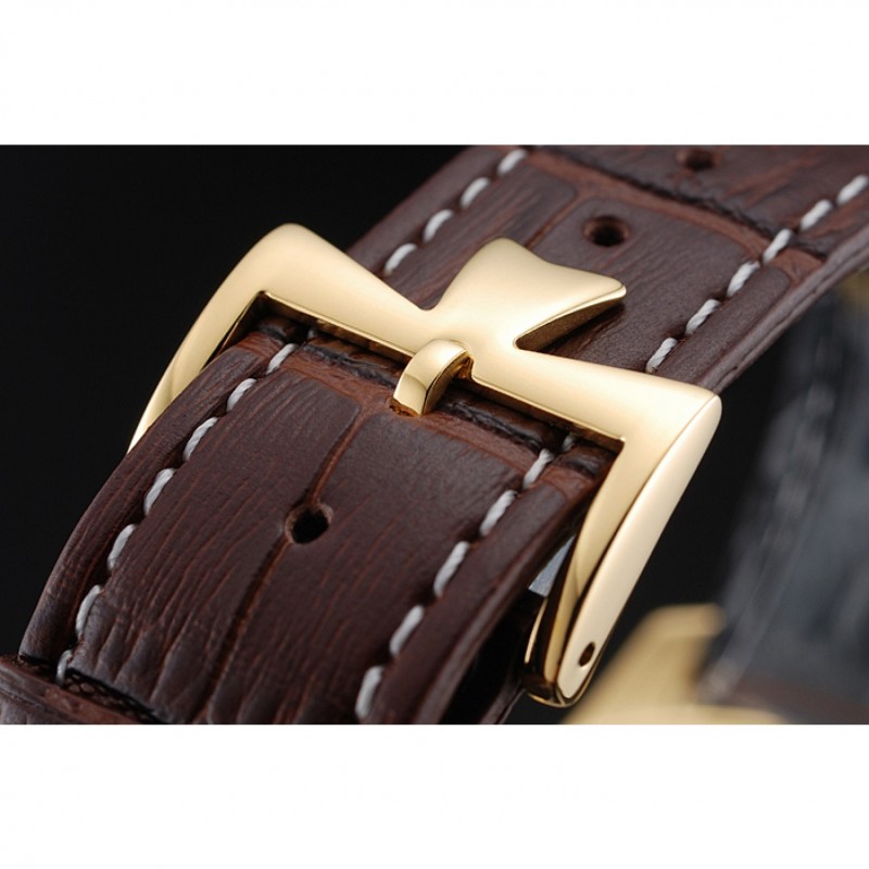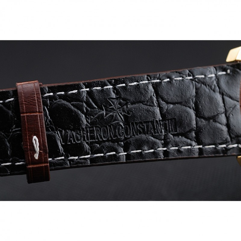 pulsera: Vacheron Constantin y correa de cuero de calor logotipo en relieve cocodrilo marrón con costuras de hilo blanco y logo Vacheron Constantin tallado 18k oro amarillo broche plateado gancho hebilla
