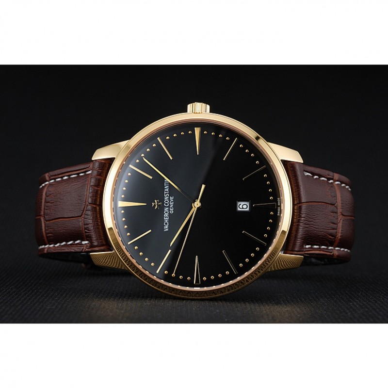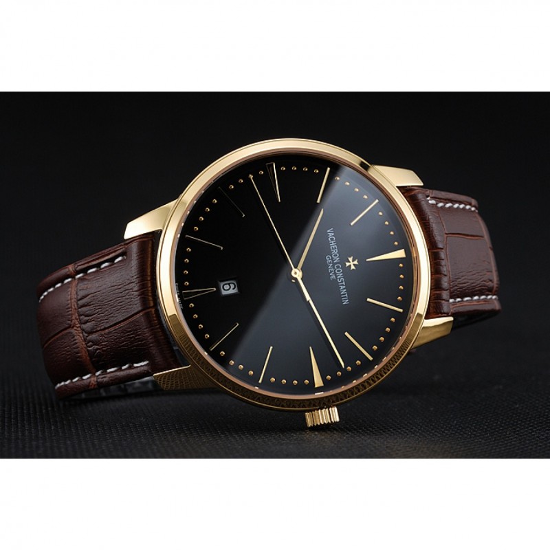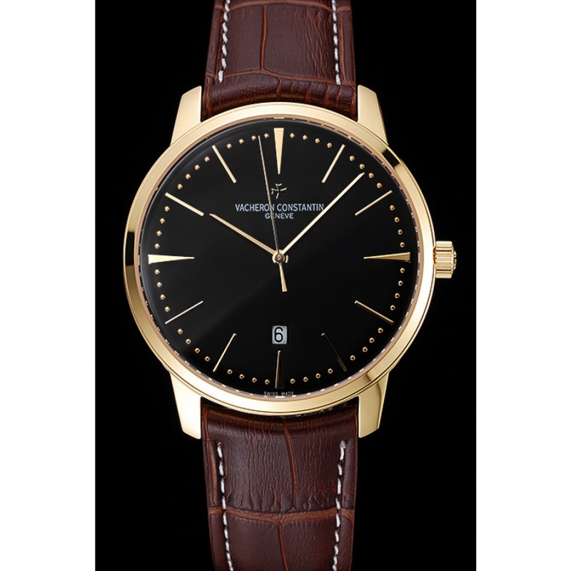 pulsera: Vacheron Constantin y correa de cuero de calor logotipo en relieve de cocodrilo negro con costuras de hilo blanco y logo Vacheron Constantin talladas 18k oro amarillo gancho plateado corchete -buckle