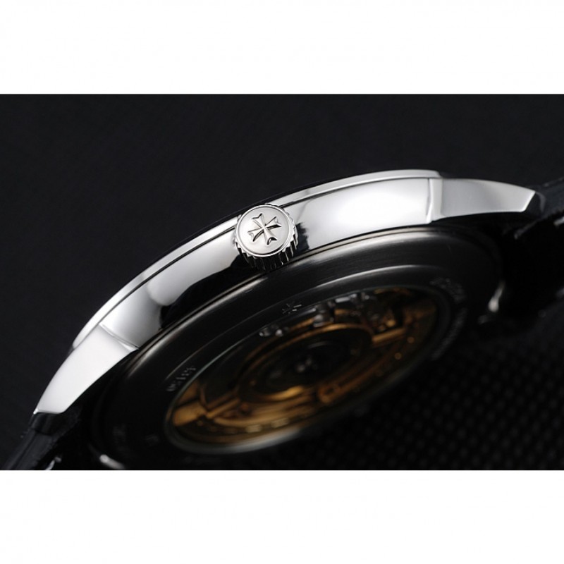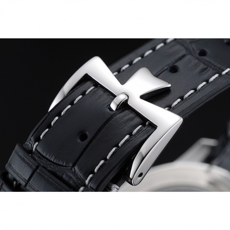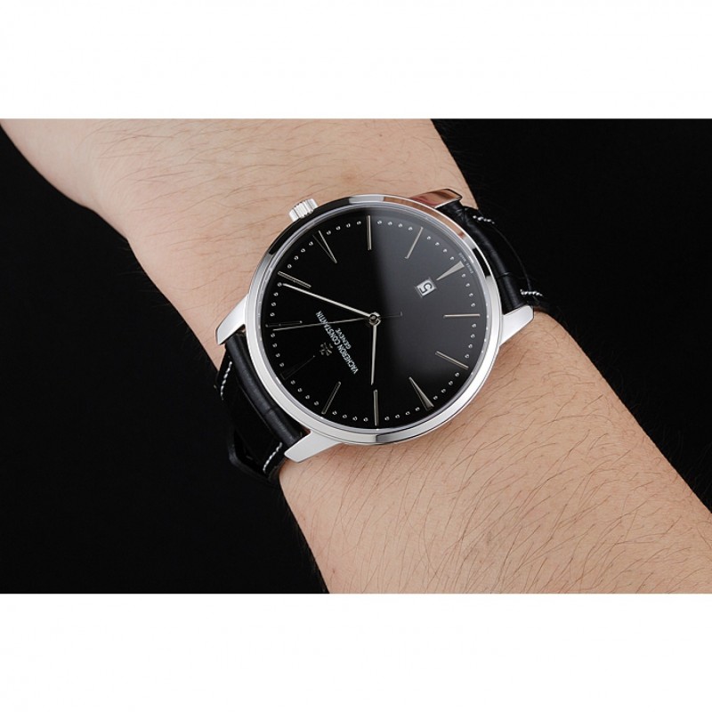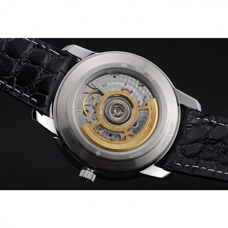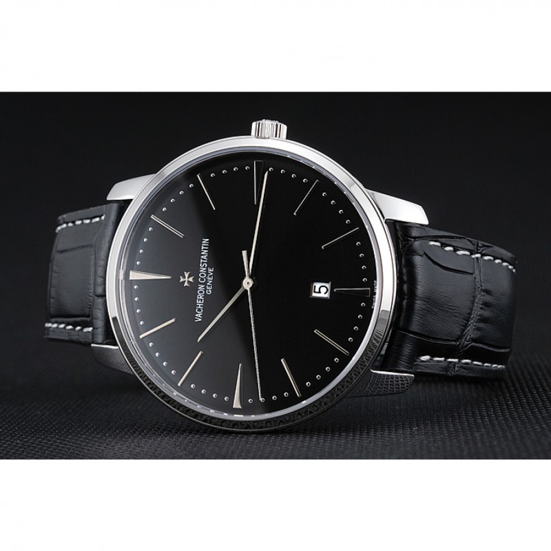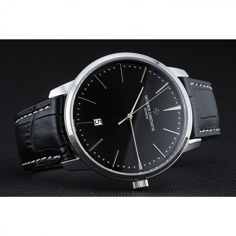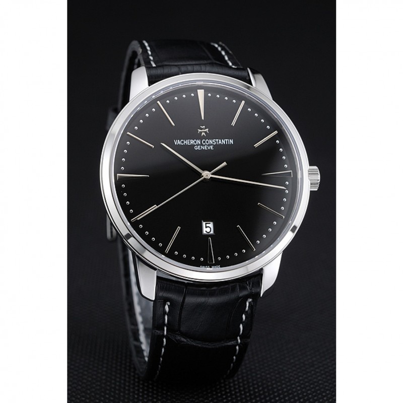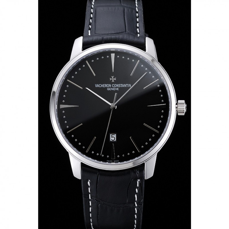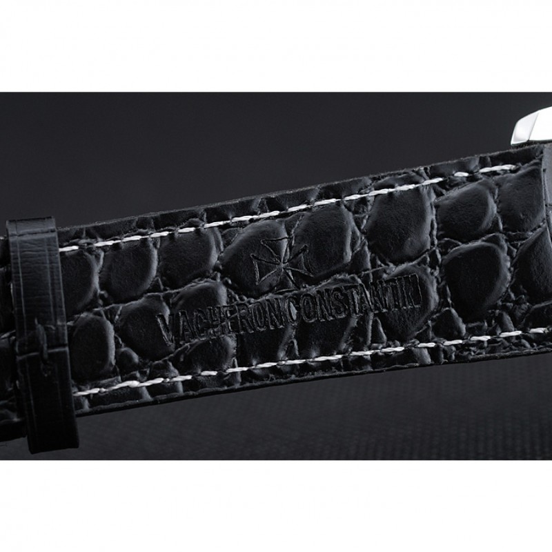 pulsera: Vacheron Constantin y correa de cuero de calor logotipo en relieve de cocodrilo negro con costuras de hilo blanco y logo Vacheron Constantin tallado de acero inoxidable pulido de gancho hebilla de cierre