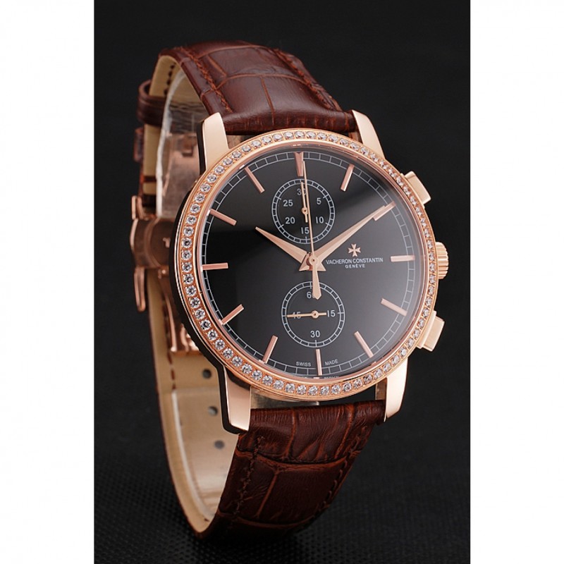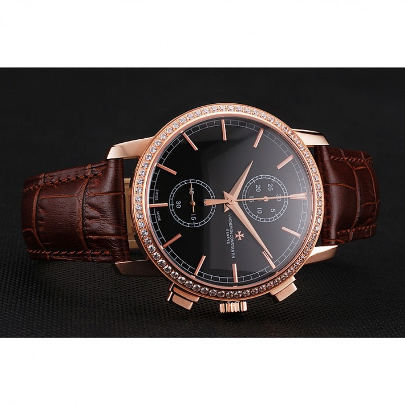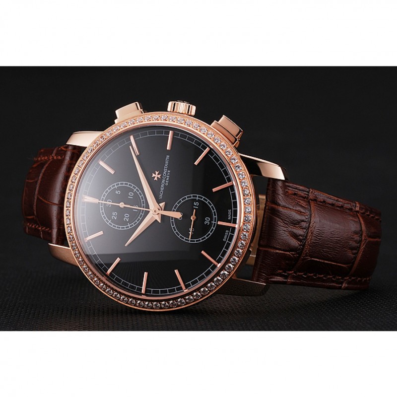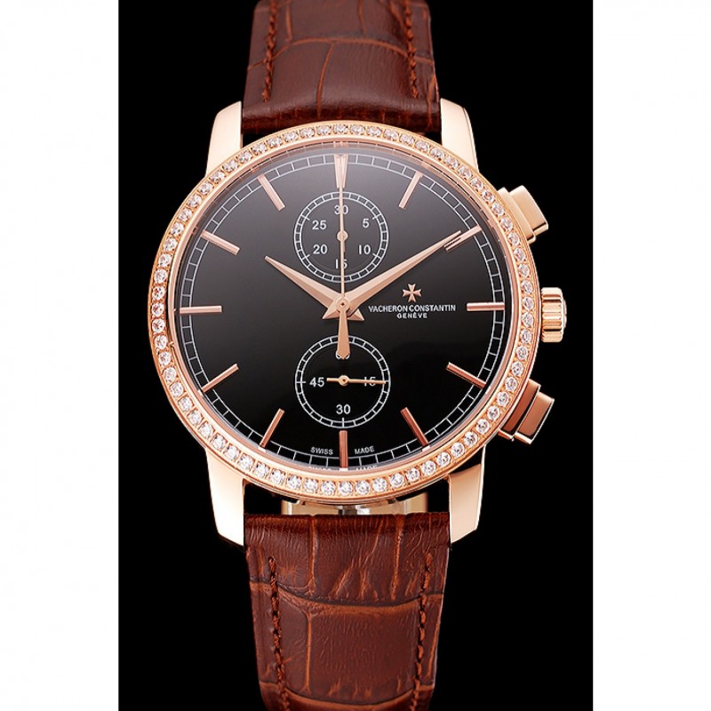 Inicio / Vacheron Constantin / Suiza Vacheron Constantin Patrimonio Tradicional cronógrafo Negro Dial Diamond Bisel de oro rosa caja Brown correa de cuero 1453765