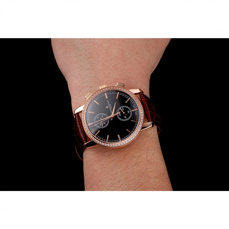 Suiza Vacheron Constantin Patrimonio Tradicional cronógrafo Negro Dial Diamond Bisel de oro rosa caja Brown correa de cuero 1453765