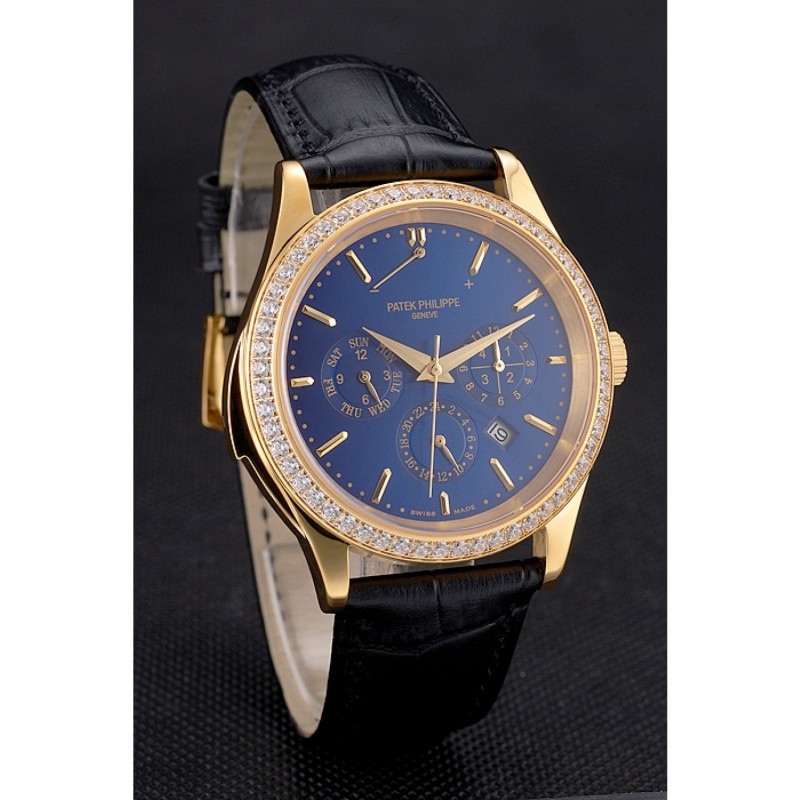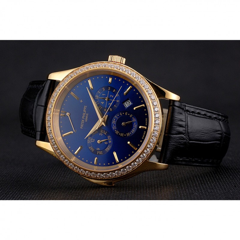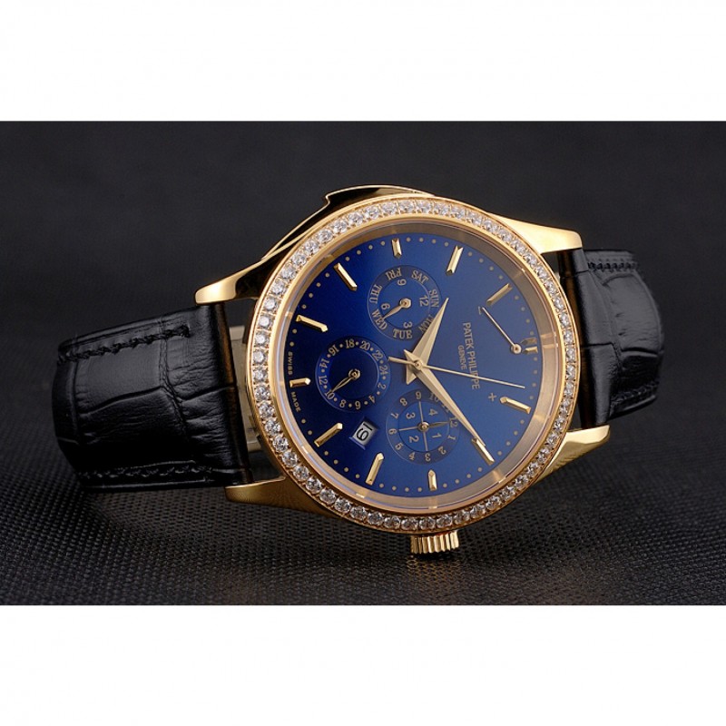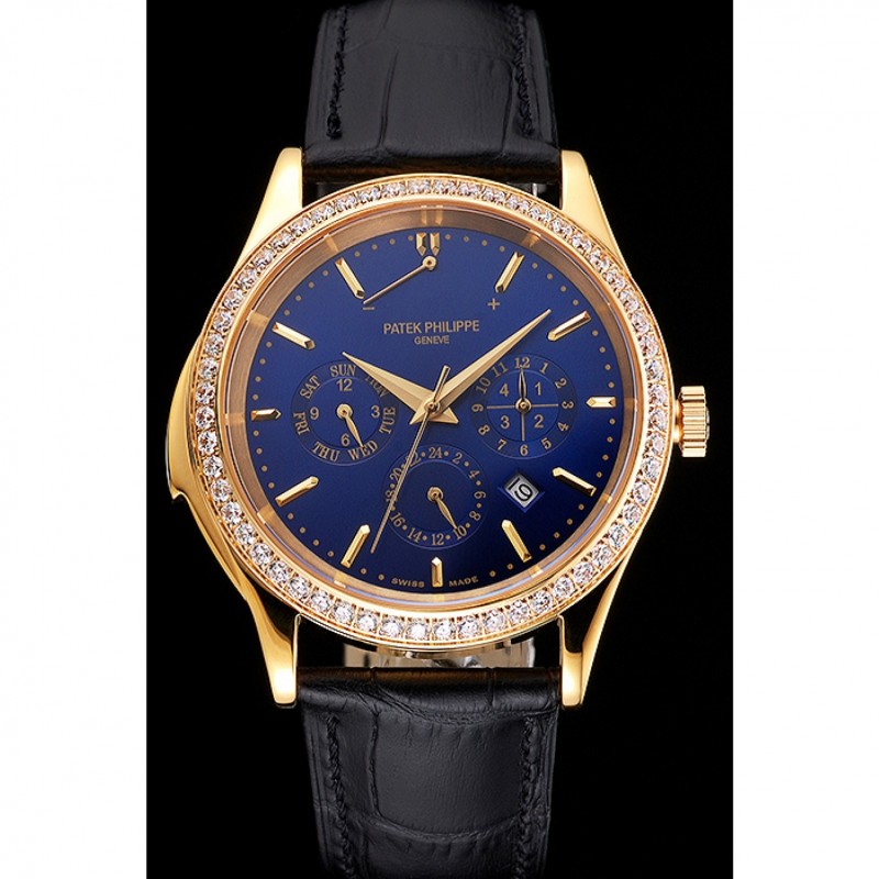 Inicio / Patek Philippe / Complications / Suizo Patek Philippe Grand complicaciones Calendario Perpetuo Dial correa de cuero azul Bisel De Oro Diamante Negro