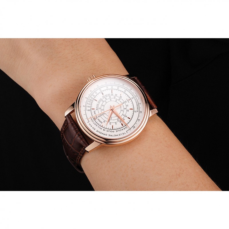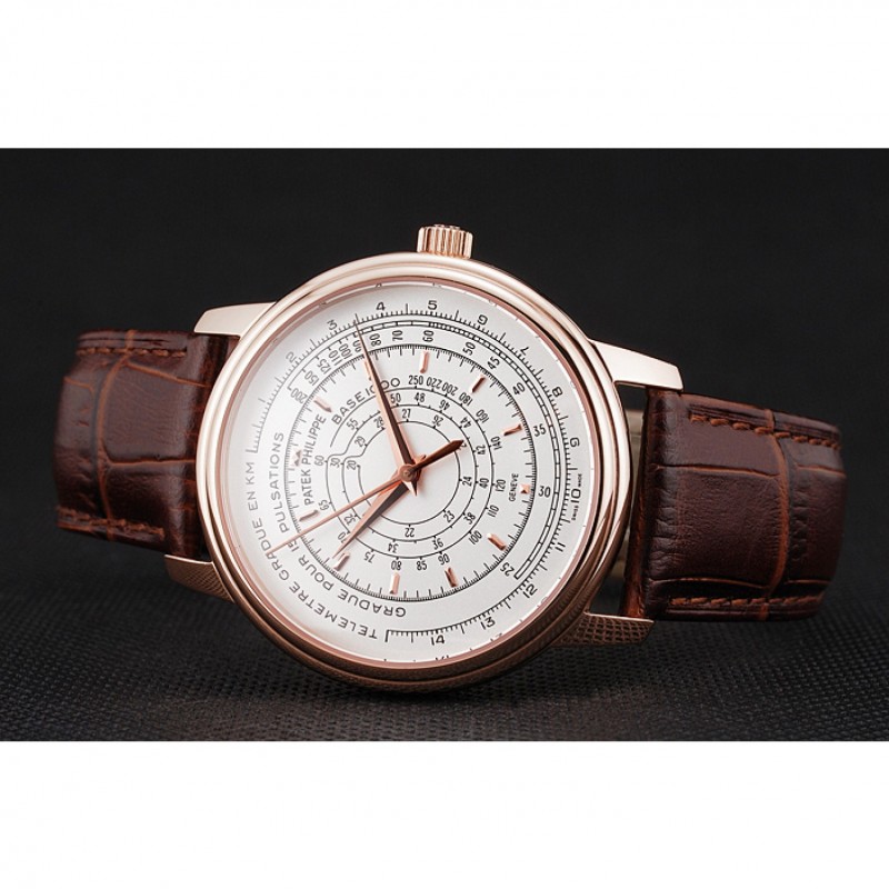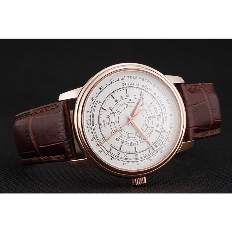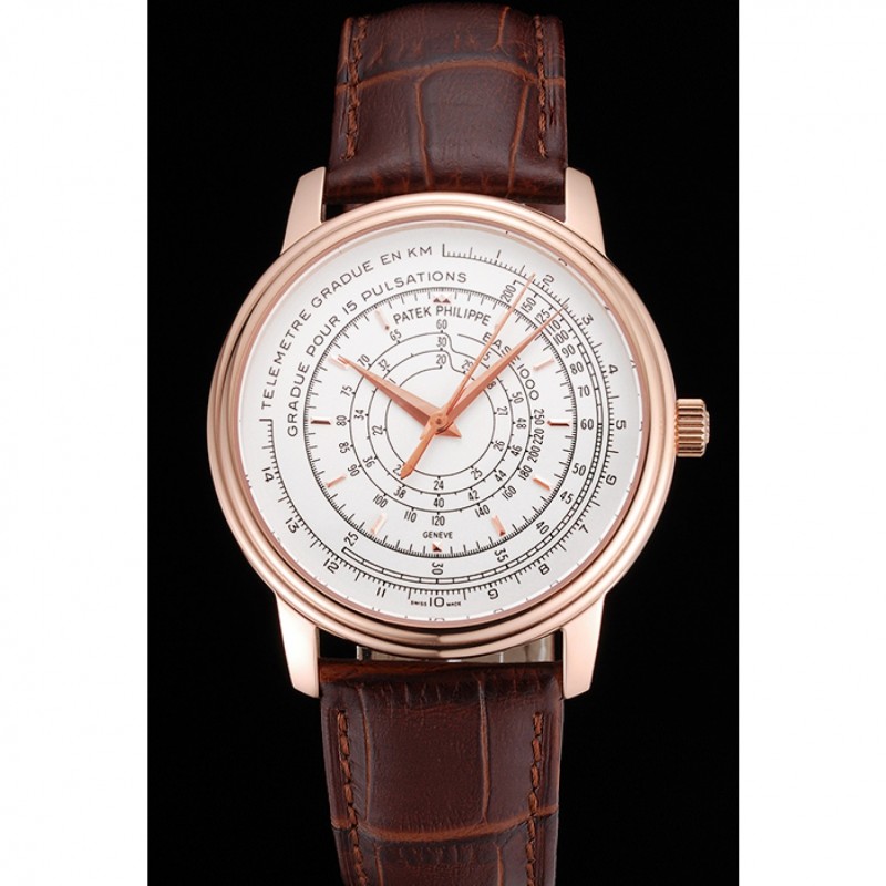 Inicio / Patek Philippe / Complications / Suizo Patek Philippe Multi-Scale cronógrafo esfera blanca correa de cuero de oro rosa caja Brown
