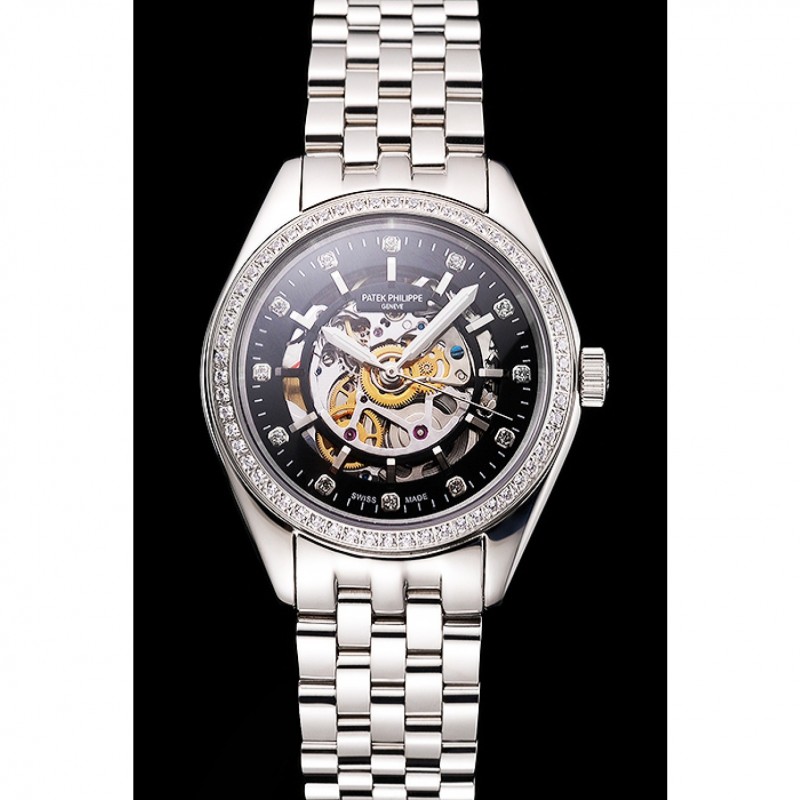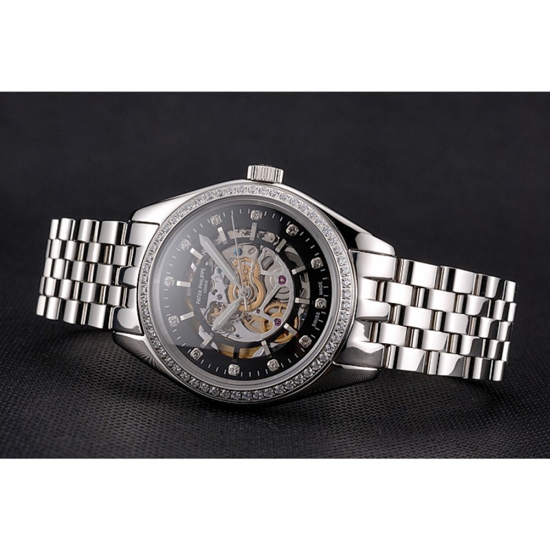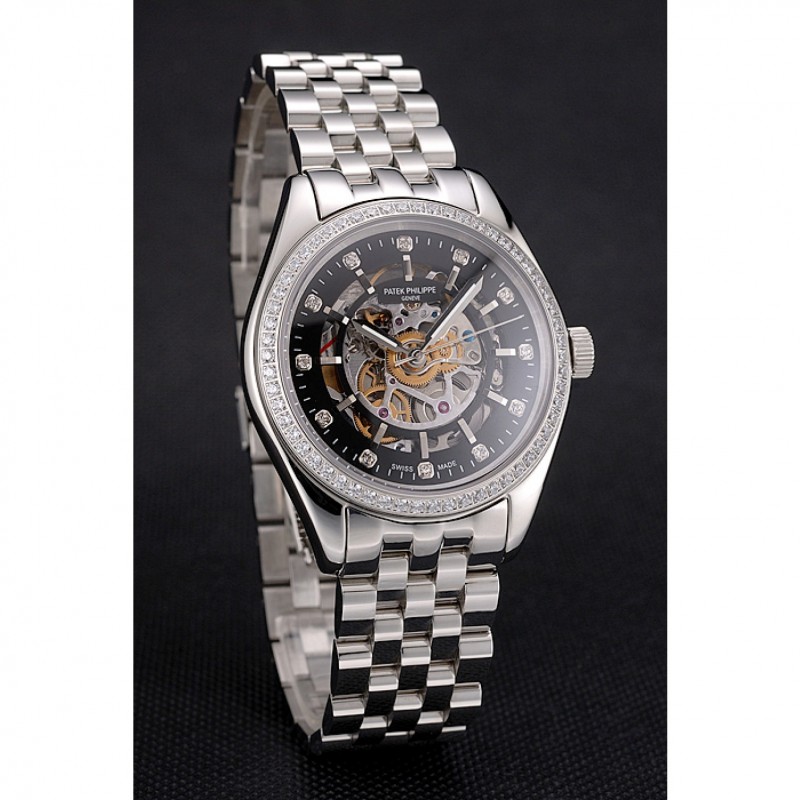Volver: transparentes mecánicos-revelando pulido acero inoxidable complemento de vuelta con Patek Philippe y el logotipo grabado