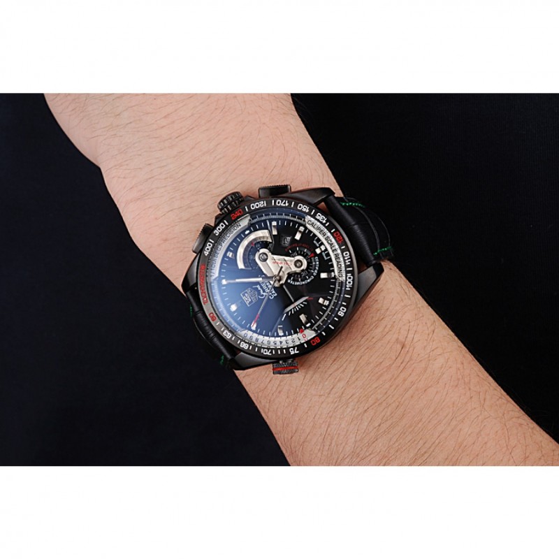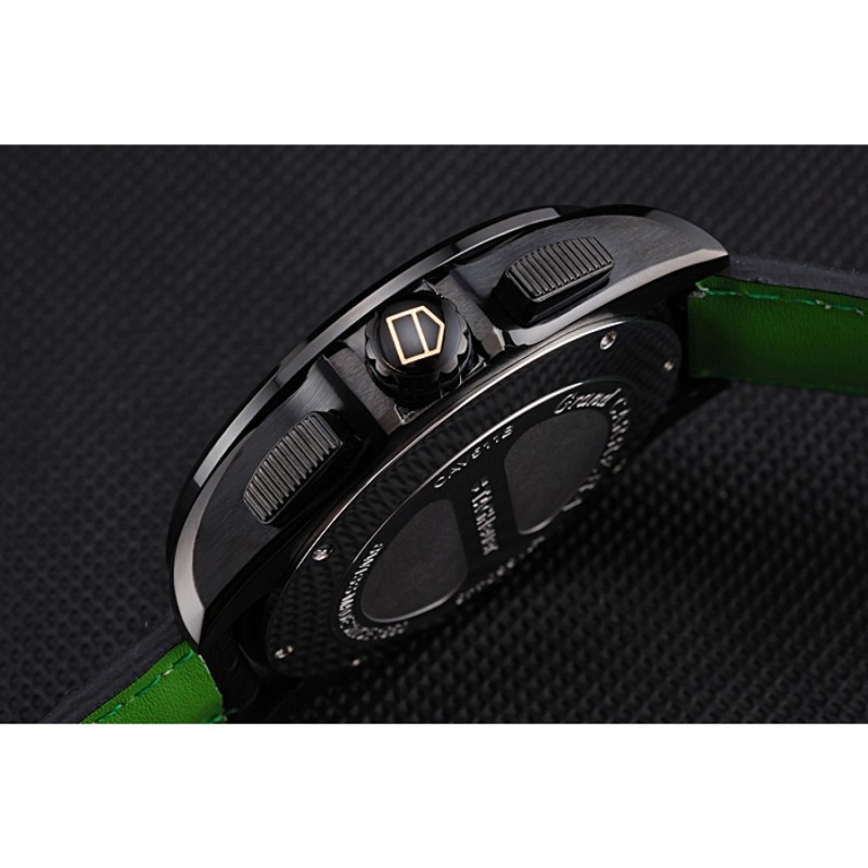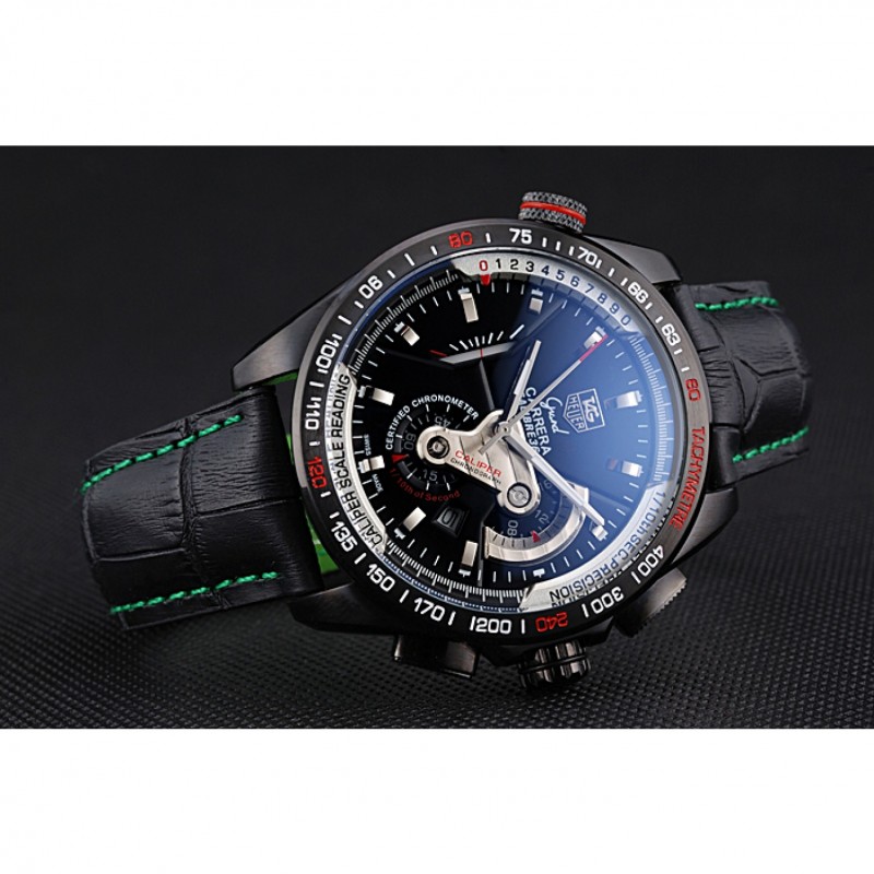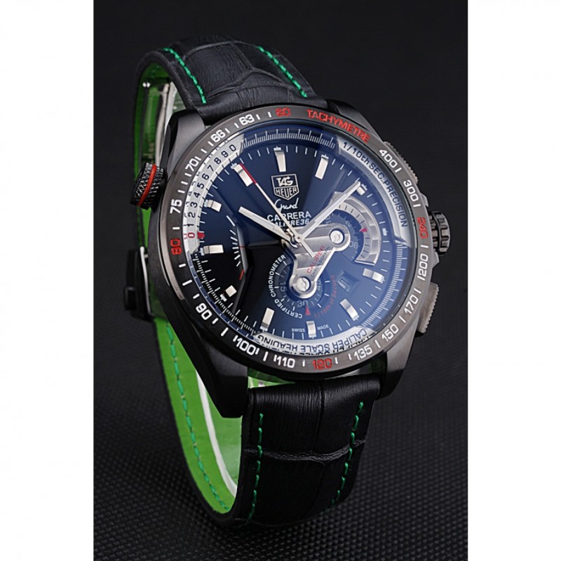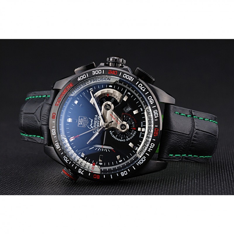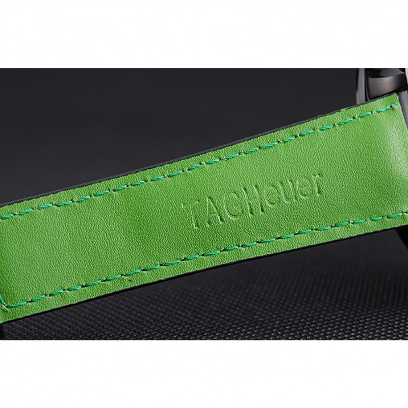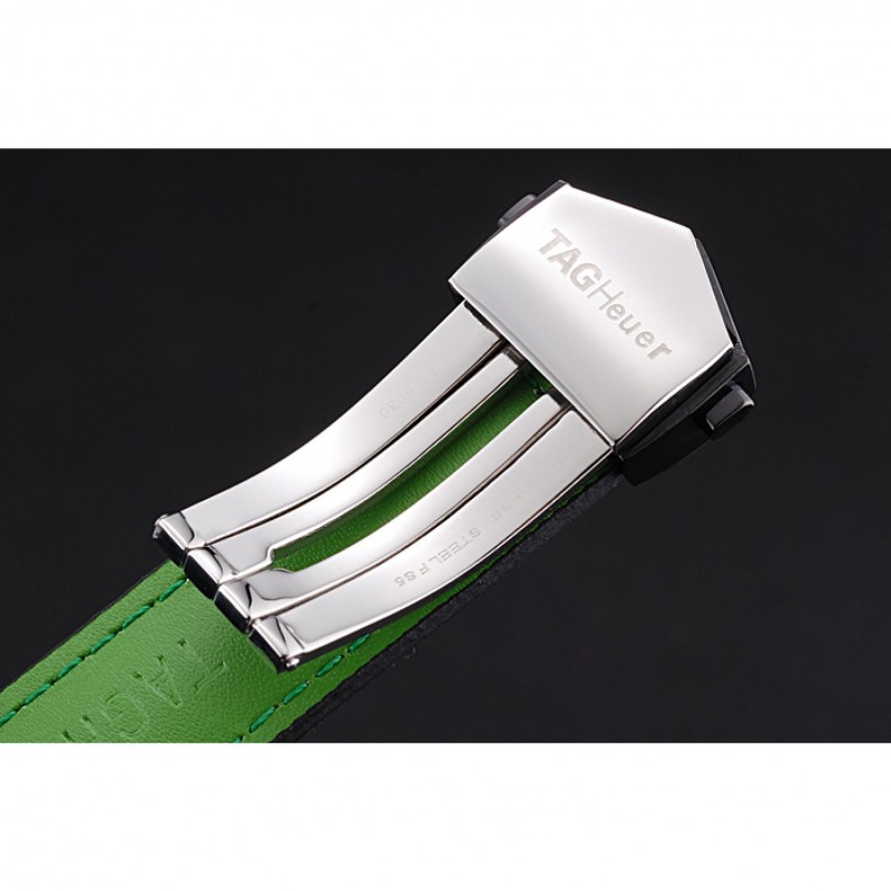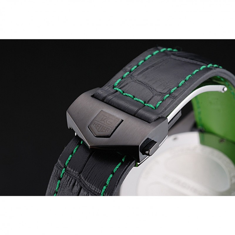 pulsera: Heat relieve Tag correa de piel de cocodrilo negro Heuer con costuras de hilo verde y de liberación empuje ion-plateado pliegue sobre el corchete con Tag logo Heuer en la parte superior