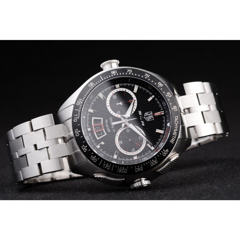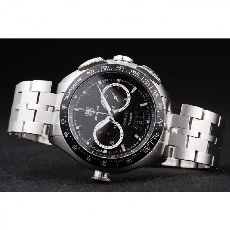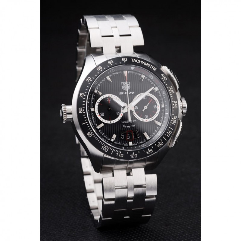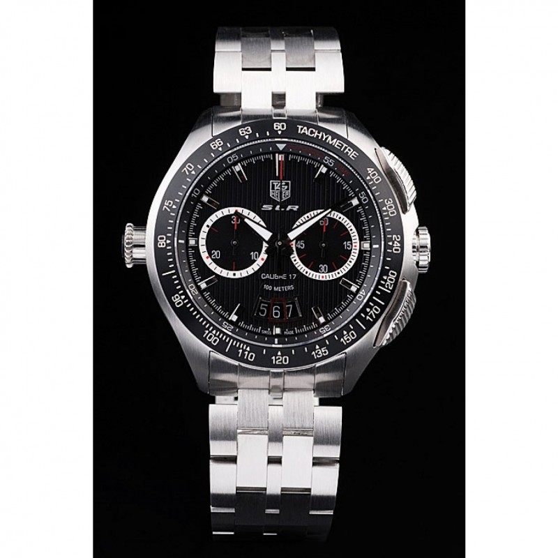 corona: pulido corona calado de acero inoxidable con SLR grabado más dos coronas de pulsador rectangulares a cada lado y uno grande corona calado en el lado opuesto con la etiqueta logotipo Heuer