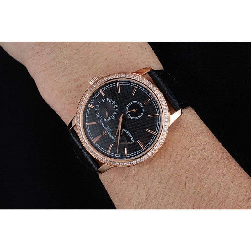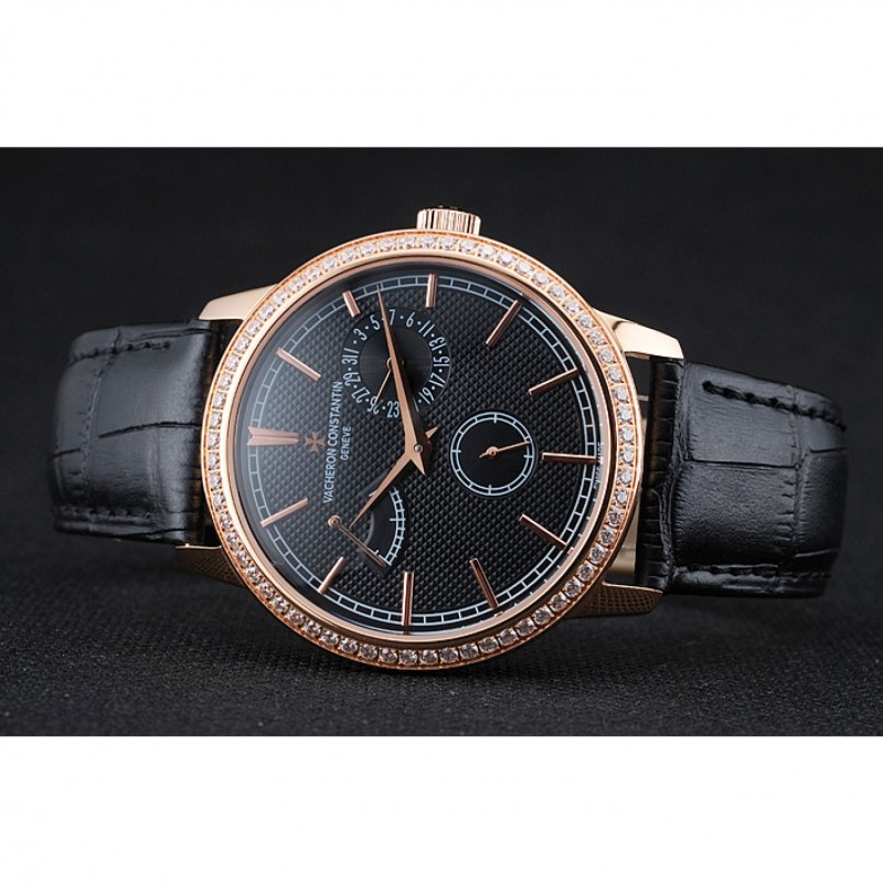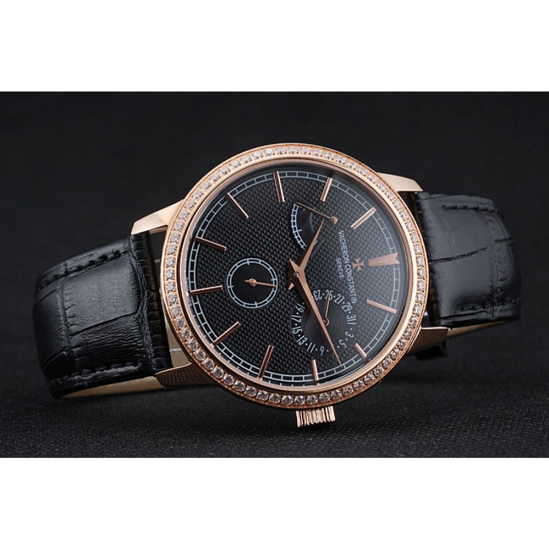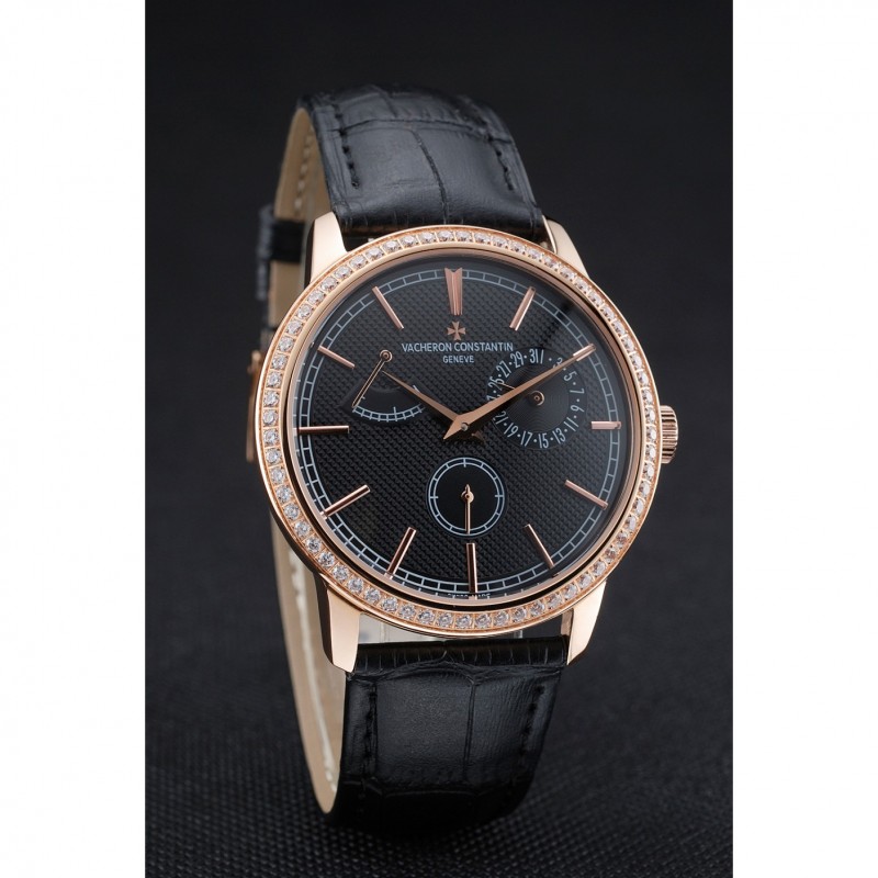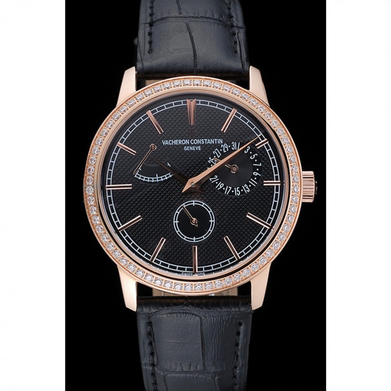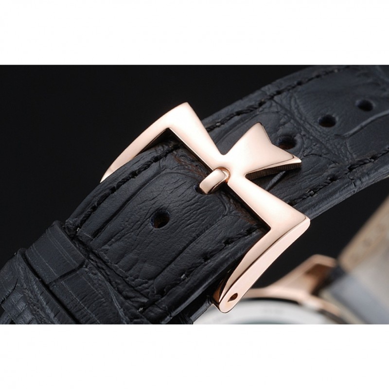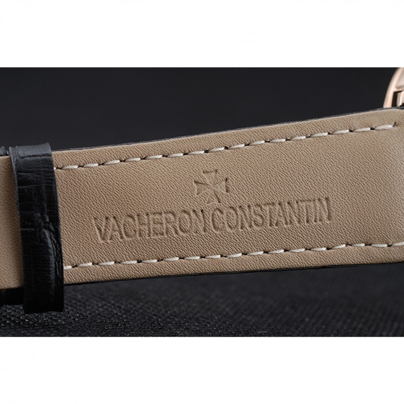 pulsera: correa de piel de cocodrilo negro de calor Vacheron Constantin en relieve con el logotipo de Vacheron Constantin 18k tallado de oro rosa plateado broche de gancho hebilla